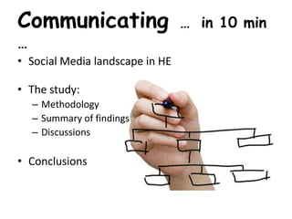 The document explores the role of social media in academic communication, highlighting its definitions, characteristics, and principles. A study was conducted via an online questionnaire with 79 respondents, focusing on their usage of social media in academic settings, the benefits and challenges faced, and the potential need for training. Key findings emphasize the advantages of accessibility and collaboration, while also addressing disadvantages such as data security and the trivialization of content.