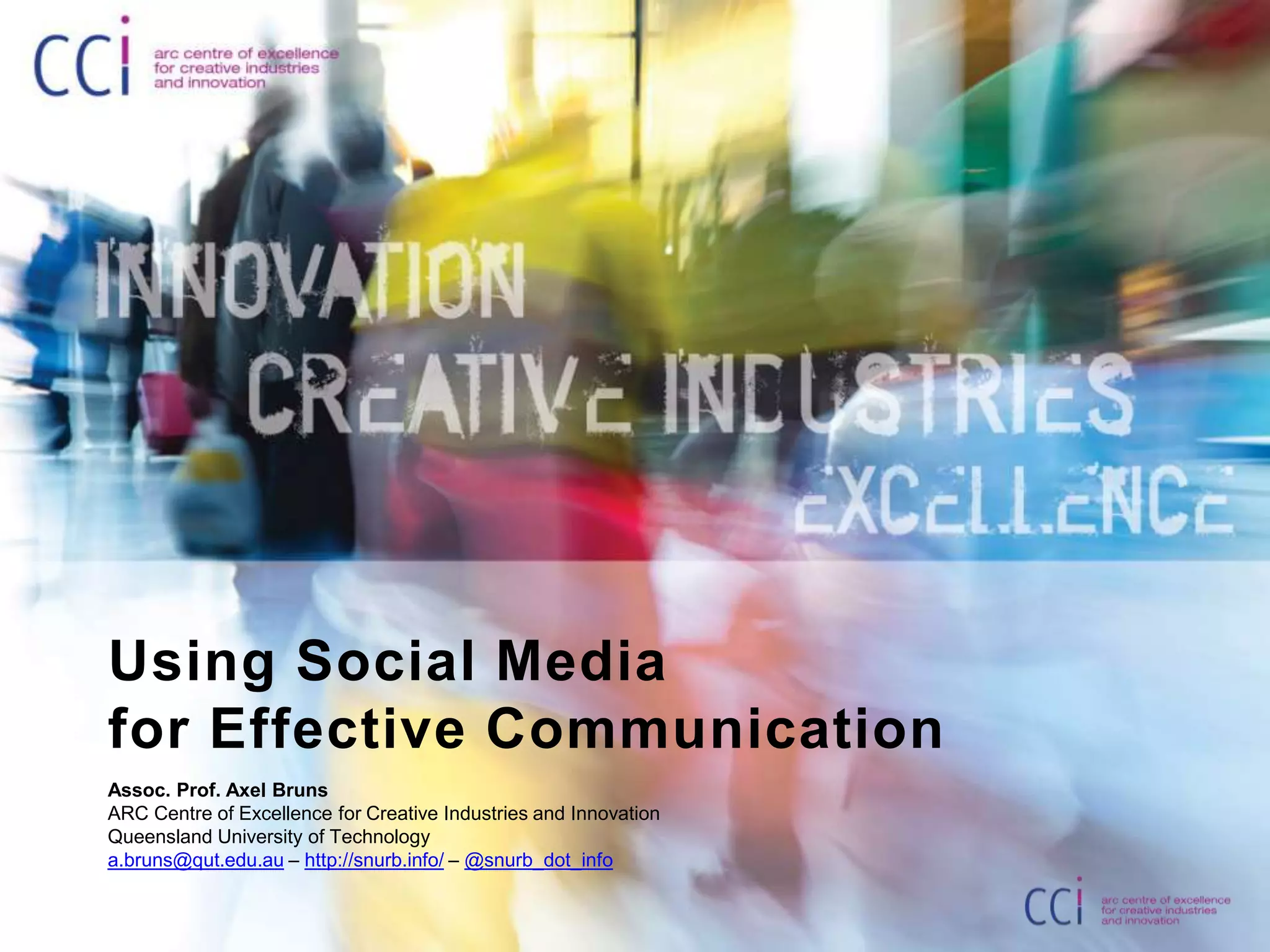 This document discusses how organizations can effectively use social media for communication. It defines social media as web 2.0 technologies combined with community. It explains that communities form concentric circles around shared values and membership levels. It recommends that organizations encourage constructive participation, develop closer brand ties through various social media platforms, and engage with communities by being open, seeding content and tools, supporting community dynamics, and not exploiting users.