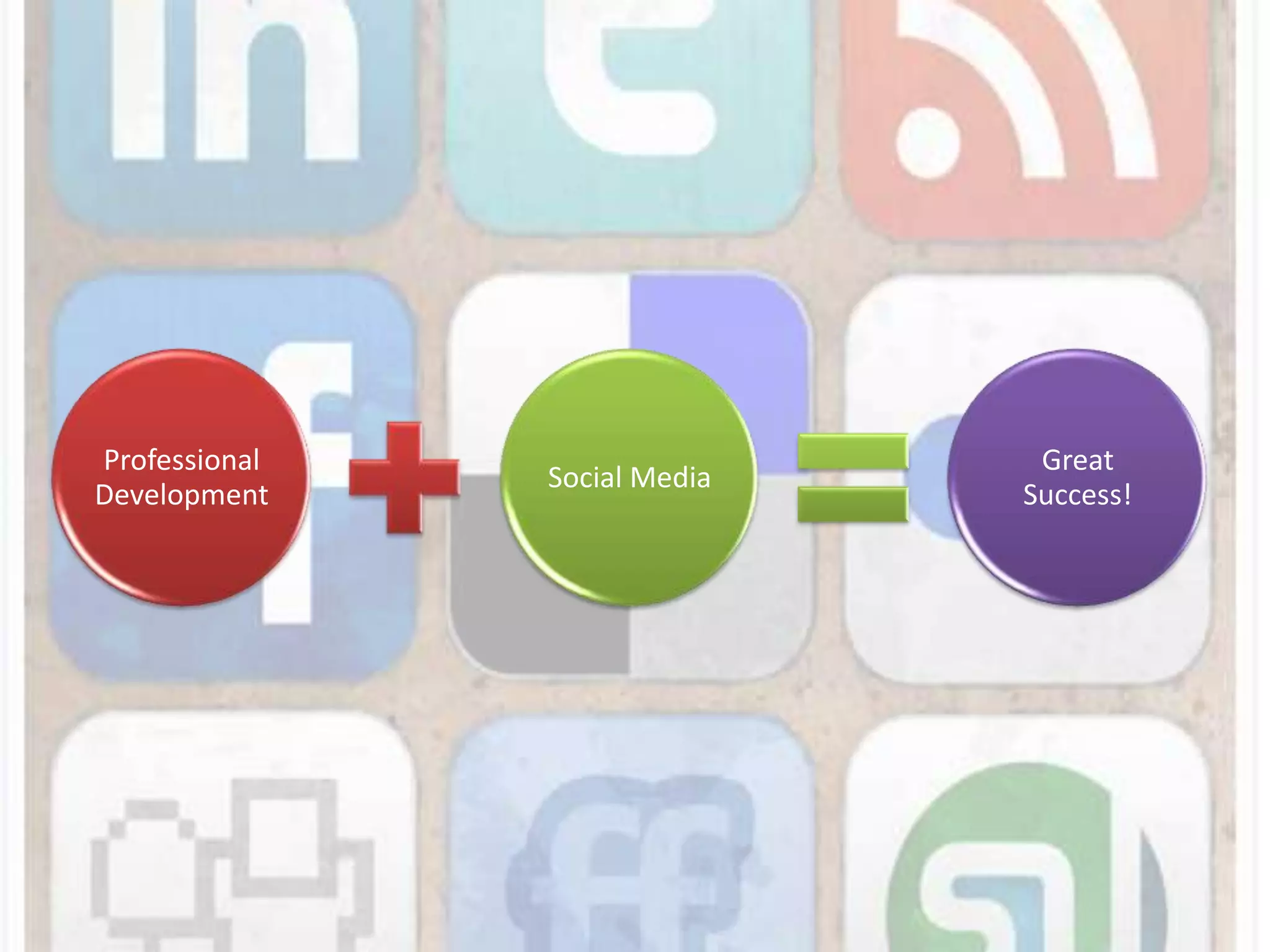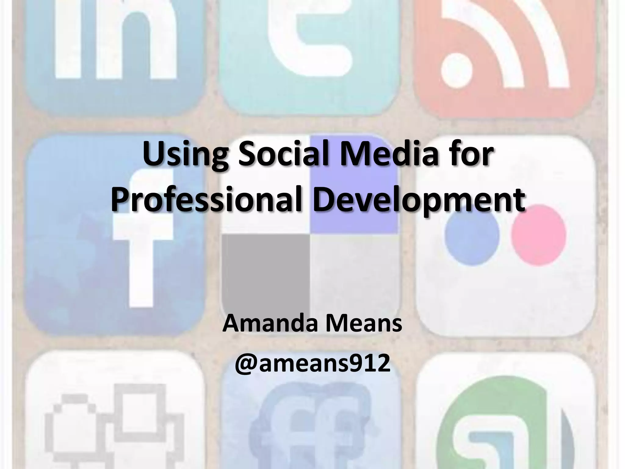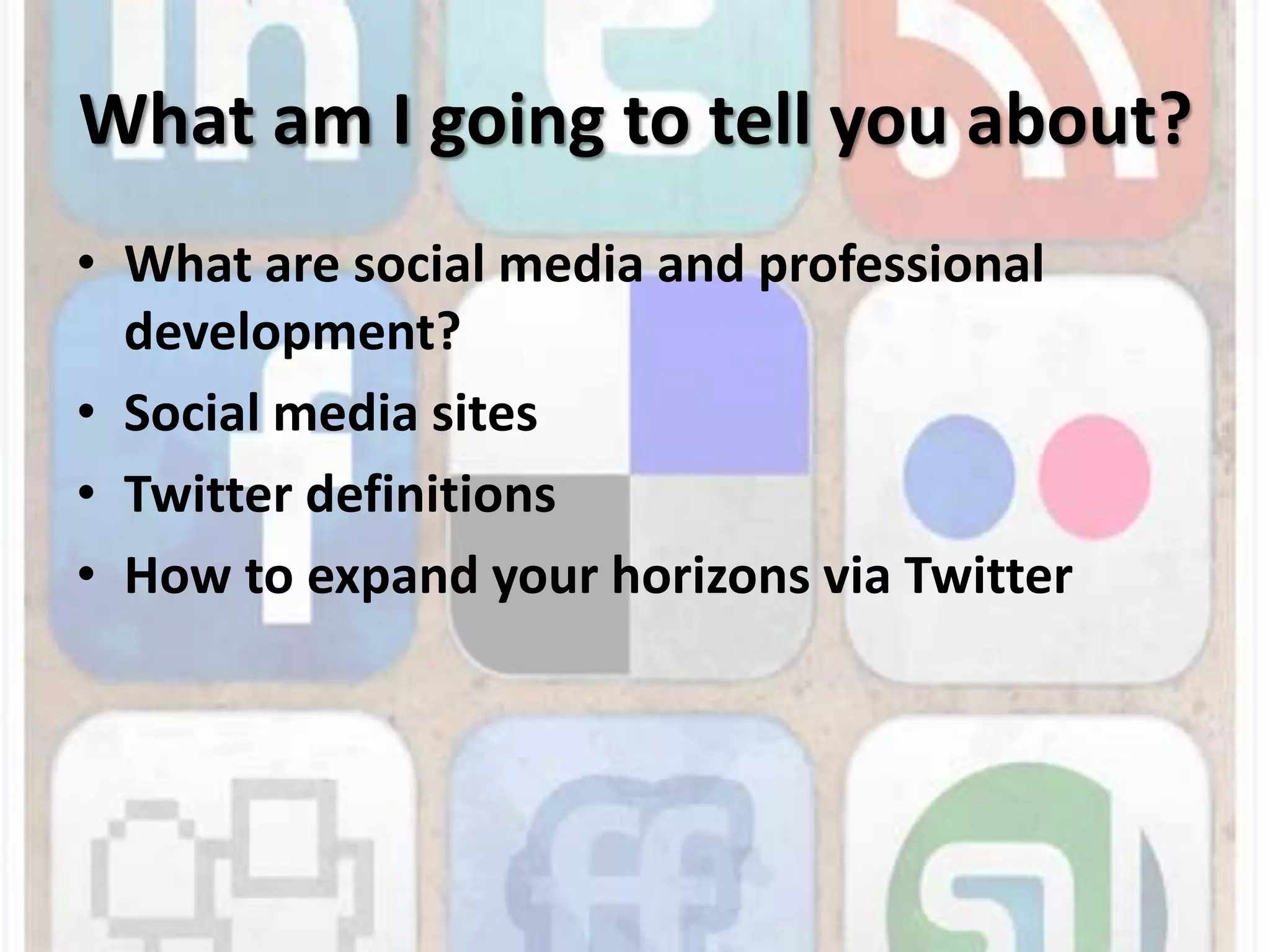 The document discusses using social media for professional development. It identifies top social media sites like Facebook, YouTube, LinkedIn and Twitter and explains how each can be used. Twitter is examined in more detail, defining terms like tweets, hashtags, followers and trends. The document recommends using LinkedIn and Twitter for professional networking and development. It provides tips for beginners and advanced users on how to expand their network on Twitter through following others, participating in relevant discussions and using tools like TweetDeck or HootSuite.