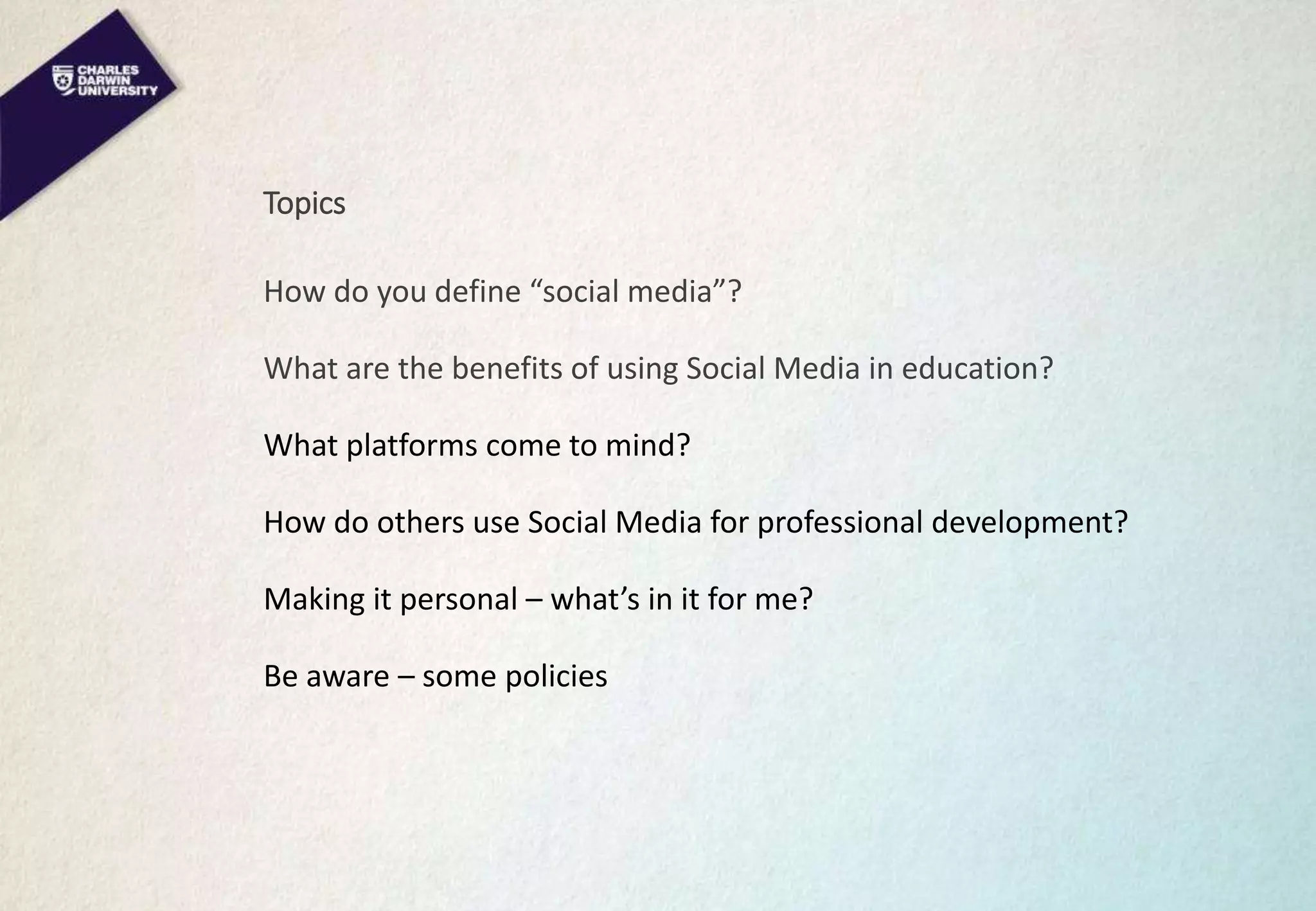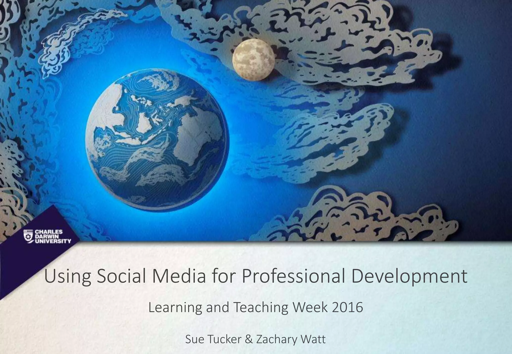 This document discusses using social media for professional development. It defines social media and lists popular platforms like Twitter, LinkedIn, Facebook and Slideshare. The benefits of social media for educators include finding resources, sharing ideas, following other educators, getting support, and making international connections. Examples are given of how educators use different platforms, including participating in online discussions and conferences. Tips are provided on setting up a Twitter account and engaging professionally through hashtags, mentions and retweets while avoiding personal details. Conference backchannels and education chats are highlighted. Risks like trolls are also addressed.