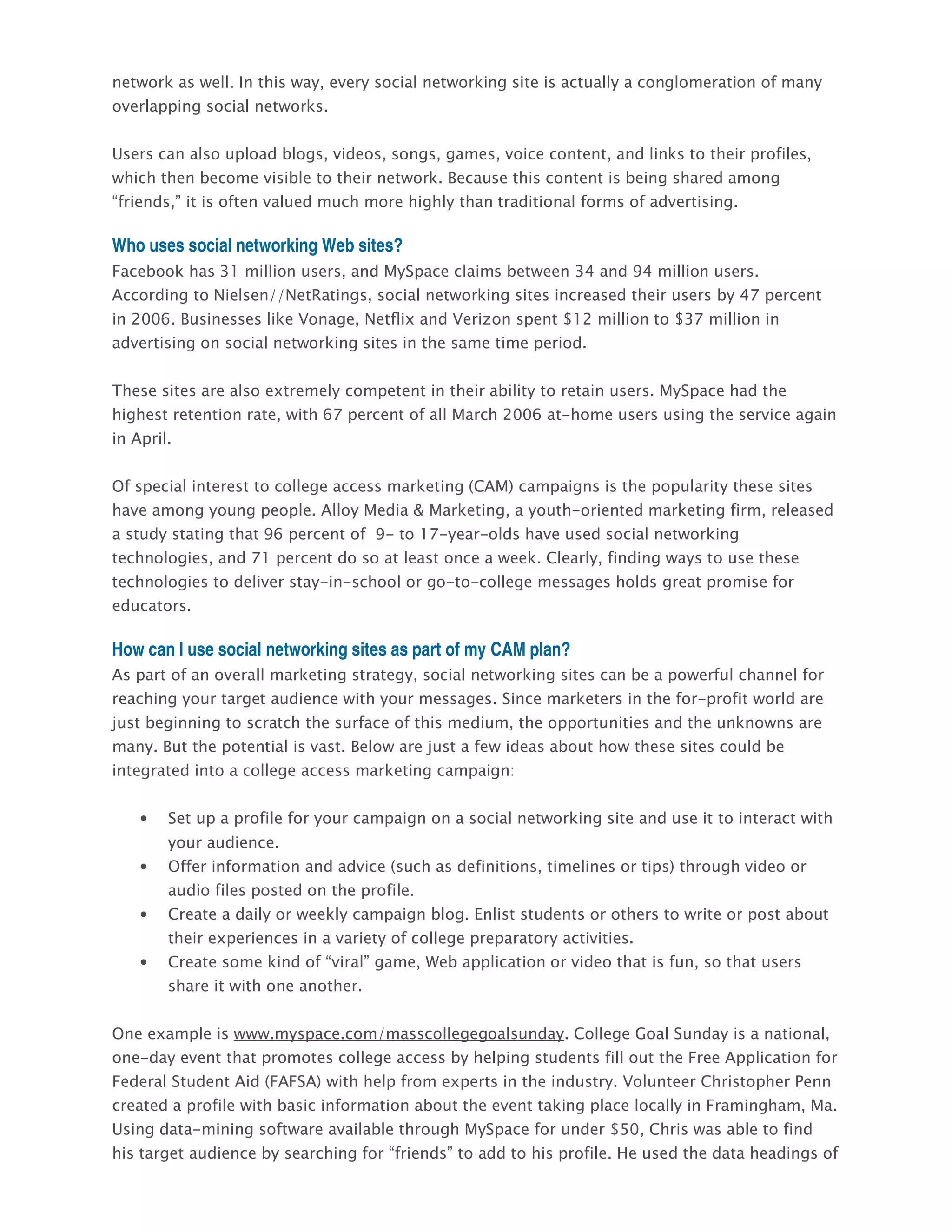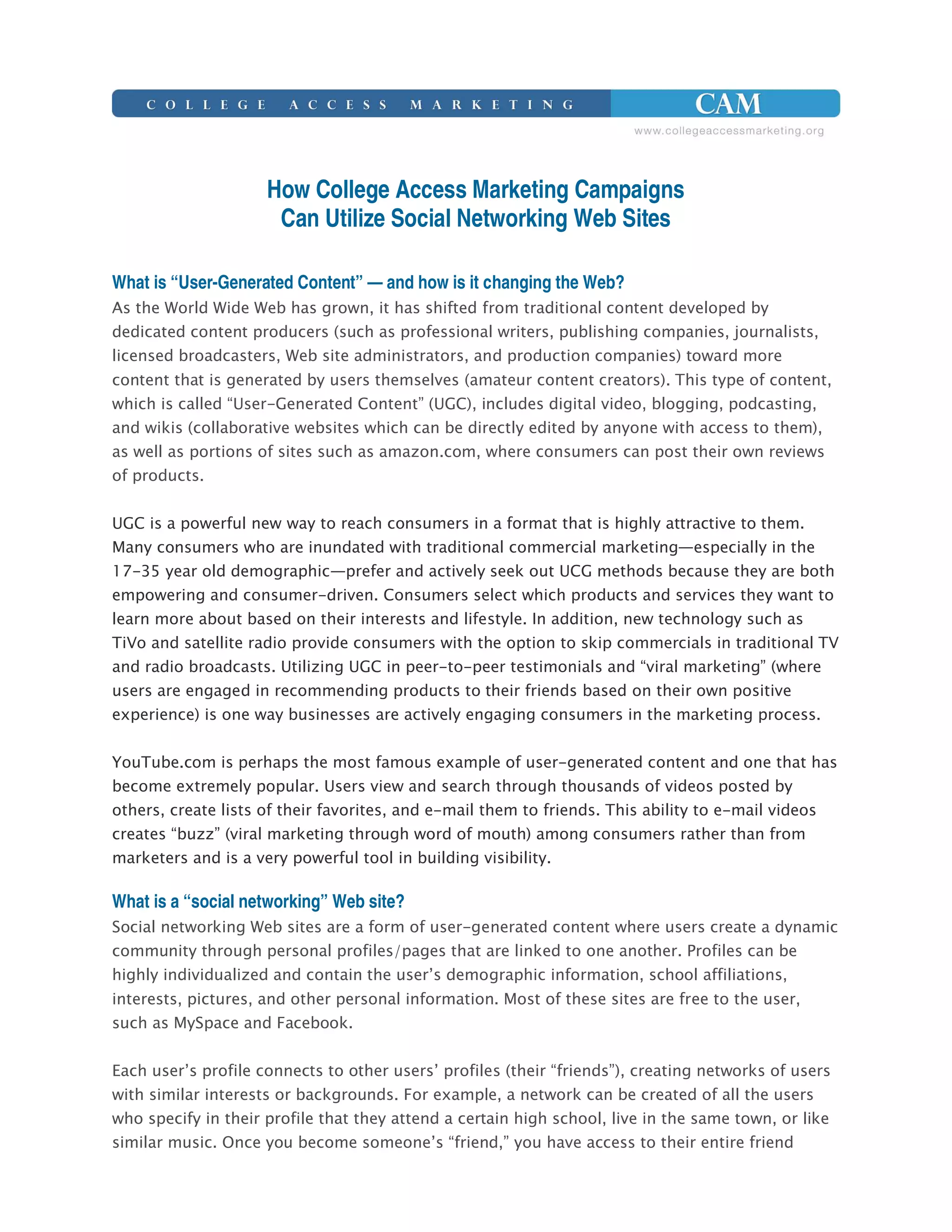 Social networking websites have become very popular, with 45% of web users now using these sites. These sites allow users to create profiles, connect with friends, and share content. Colleges can utilize social networking in their college access marketing campaigns by creating an official school profile, posting information and answering questions from prospective students on the site. They can also encourage current students to share details about their experiences on their personal profiles to help recruit new students. Using social media allows colleges to connect directly with their target audience in a space where many high school students spend much of their online time.