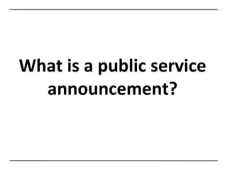 The document discusses public service announcements (PSAs) and how social media can be used to change attitudes and opinions rather than encourage consumption. It defines PSAs as advertisements intended to raise awareness of issues and stimulate action, not market products. It then lists techniques of persuasion like repetition, emotion, and peer influence that are commonly used in PSAs and encourages applying these techniques through social media to increase the reach and impact of messages aiming to change behaviors.