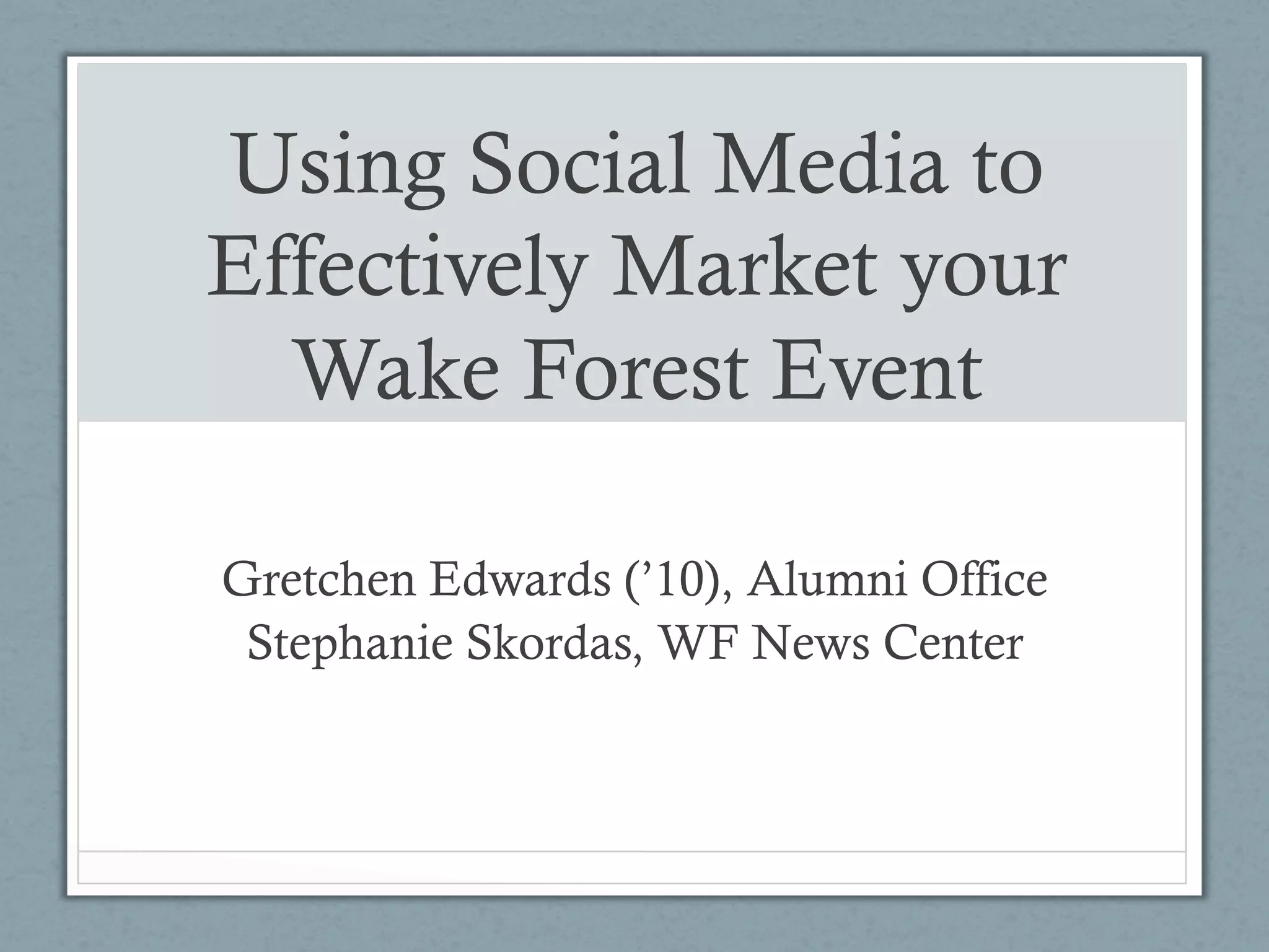 This document provides guidance on using social media to effectively market Wake Forest University events. It discusses identifying the target audience for an event, utilizing existing Wake Forest social media channels and communities, tracking results, and creating shareable content like tweets and Facebook posts. The document emphasizes setting goals for social media use, pre-writing content, measuring engagement and results, and sharing both positive and negative feedback to prove the effectiveness of social media marketing to supervisors.