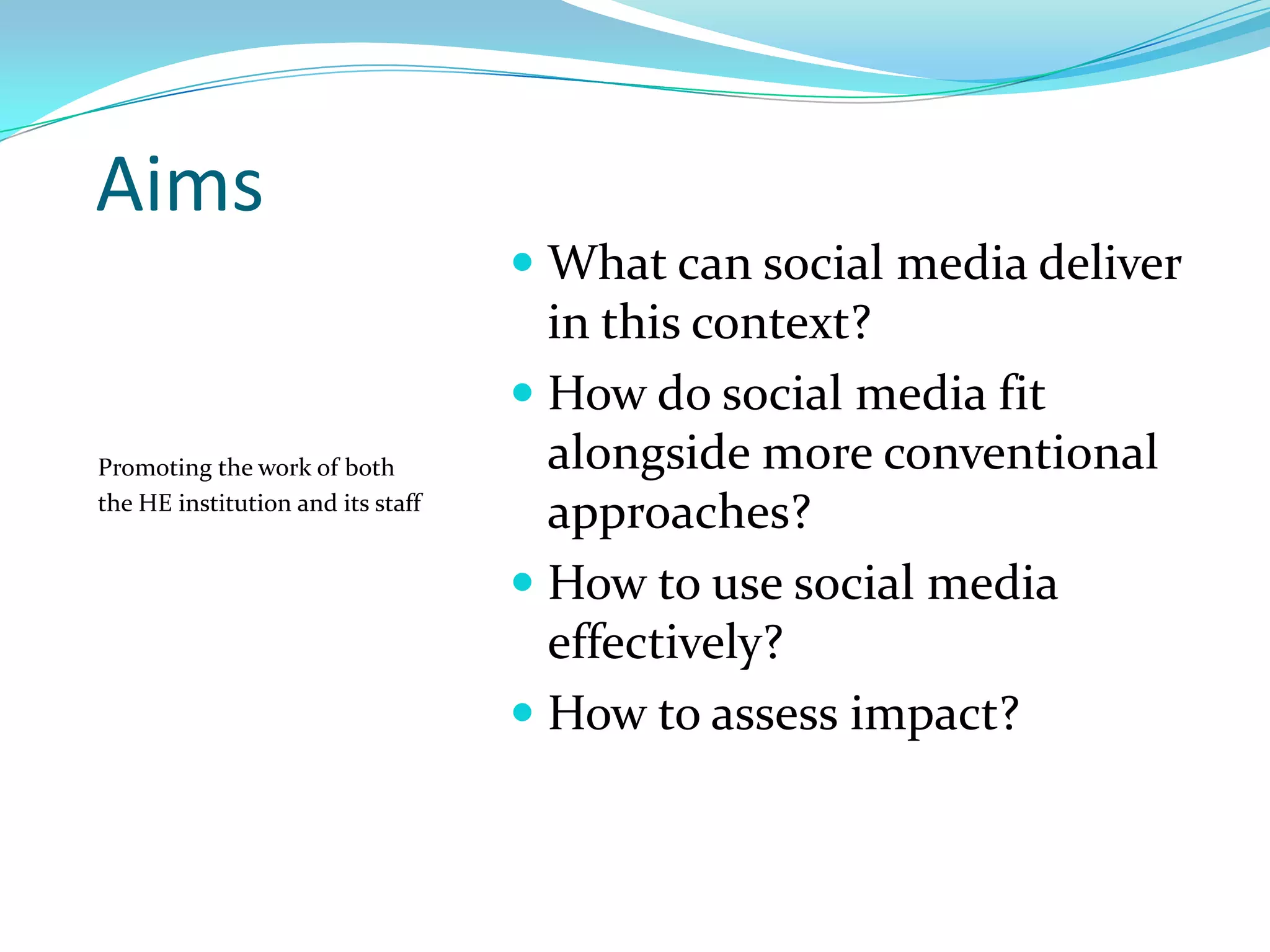This document discusses the effective use of social media by higher education institutions and academics. It outlines various social media platforms that can be used, such as Facebook, Twitter, blogs and YouTube. The benefits of using social media include creating awareness, engaging stakeholders, monitoring responses, sharing ideas and building networks. It provides tips for developing an effective social media strategy, including producing quality content and linking to other media. Finally, it discusses ways to assess the impact of social media use, such as tracking follower numbers, retweets, reach and engagement on platforms like Twitter and Facebook.