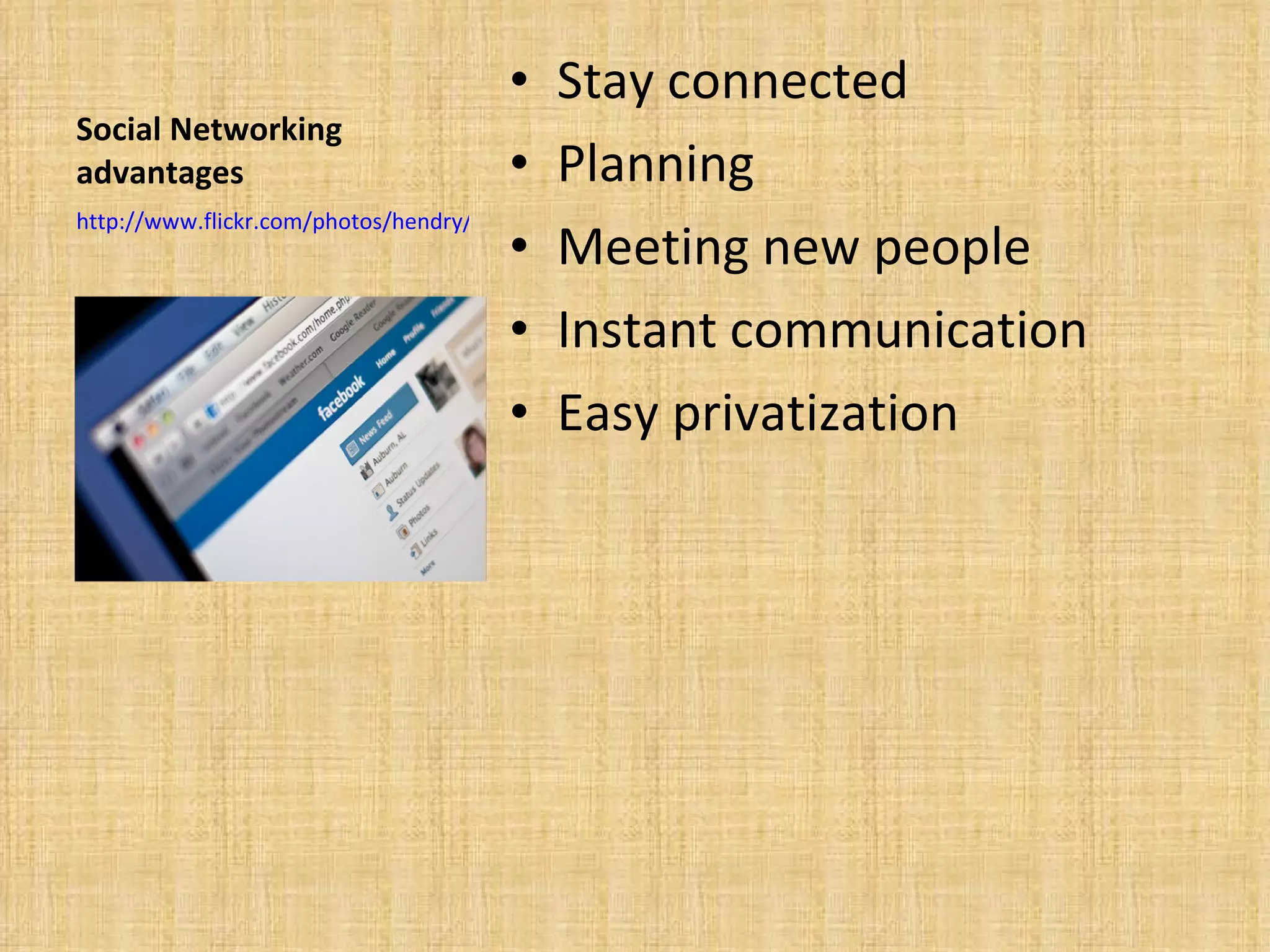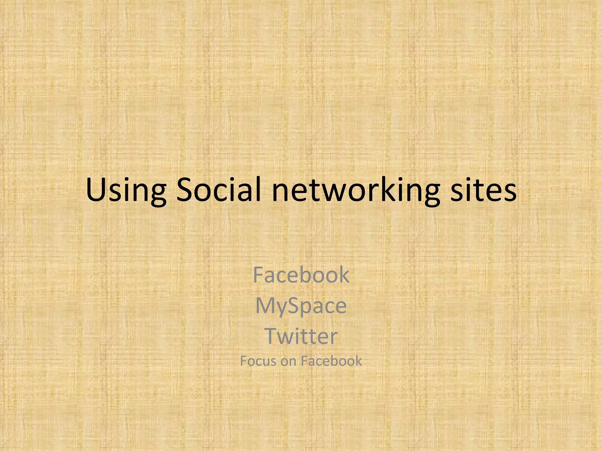 Using Social networking sites Facebook MySpace Twitter Focus on Facebook Social Networking advantages Stay connected Planning Meeting new people Instant communication Easy privatization Meet new people While this is a great advantage users must have discretion when making online friends. And in regards to what personal information they display. Over accessibility Large amounts- of private information are often displayed by users. This can be potentially hazardous to their well being. Viewed by anyone- If security precautions are not used users sites may be viewed by anyone. Negative repercussions possible-Users profiles are open to the public and may be viewed by anyone. Predators Schools Over accessibility Predators- Users of Social Networks often display too much personal information. Putting