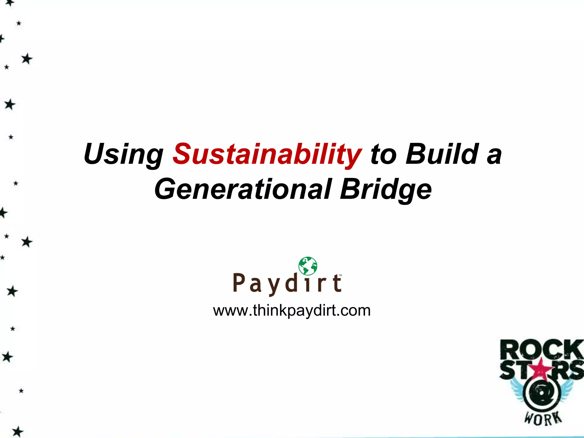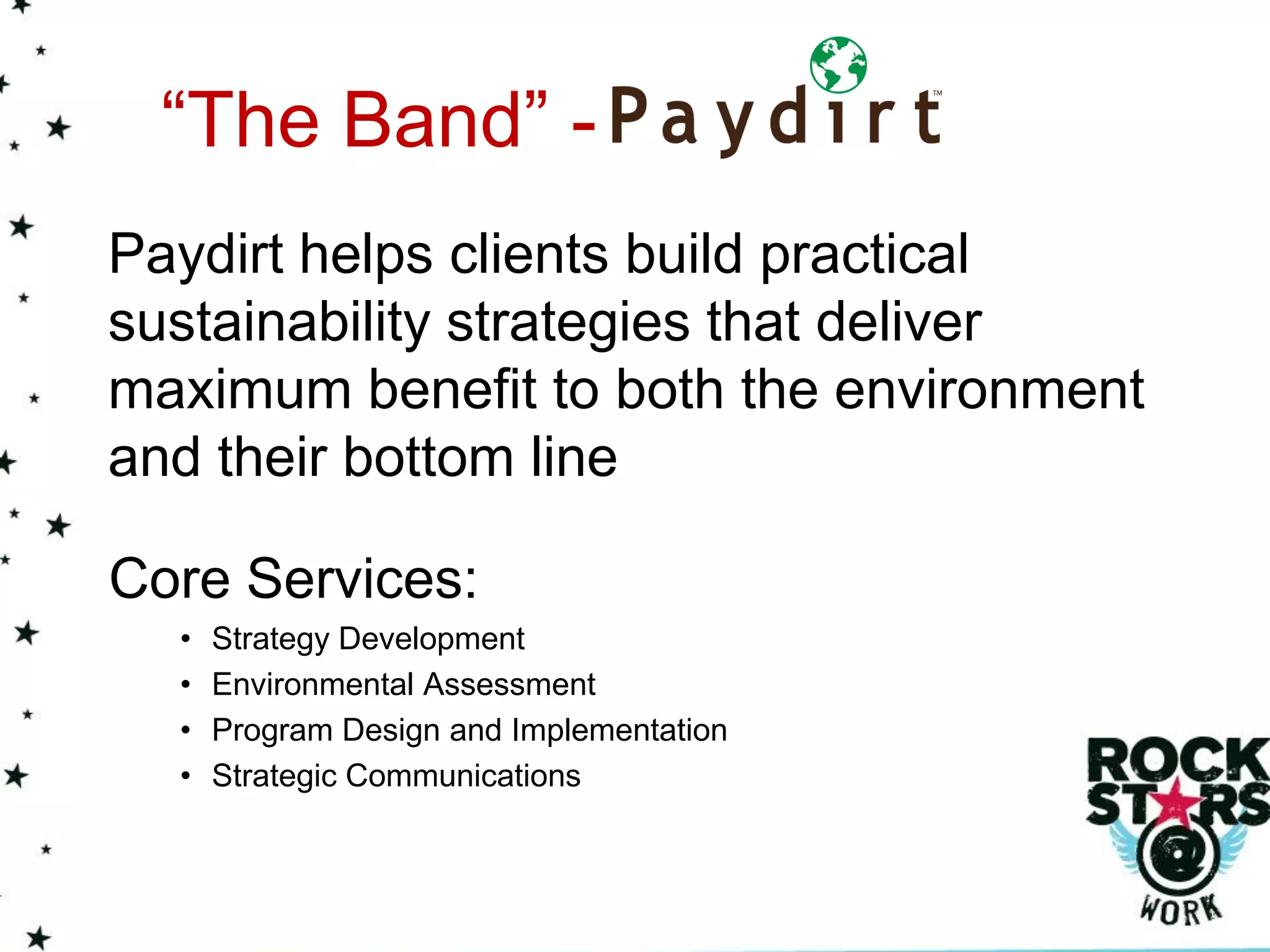 This document discusses sustainability strategies and summarizes the services of Paydirt, a consulting firm that helps clients develop sustainability plans. It outlines Paydirt's core services including strategy development, assessments, and program implementation. The document then discusses challenges in making the business case for sustainability and provides tips for engaging employees, marketing sustainability efforts, and ongoing improvement.