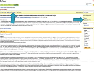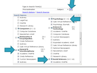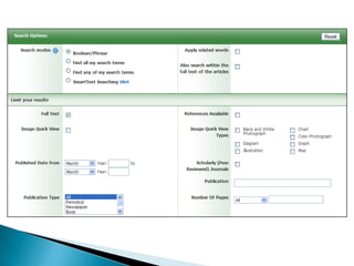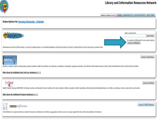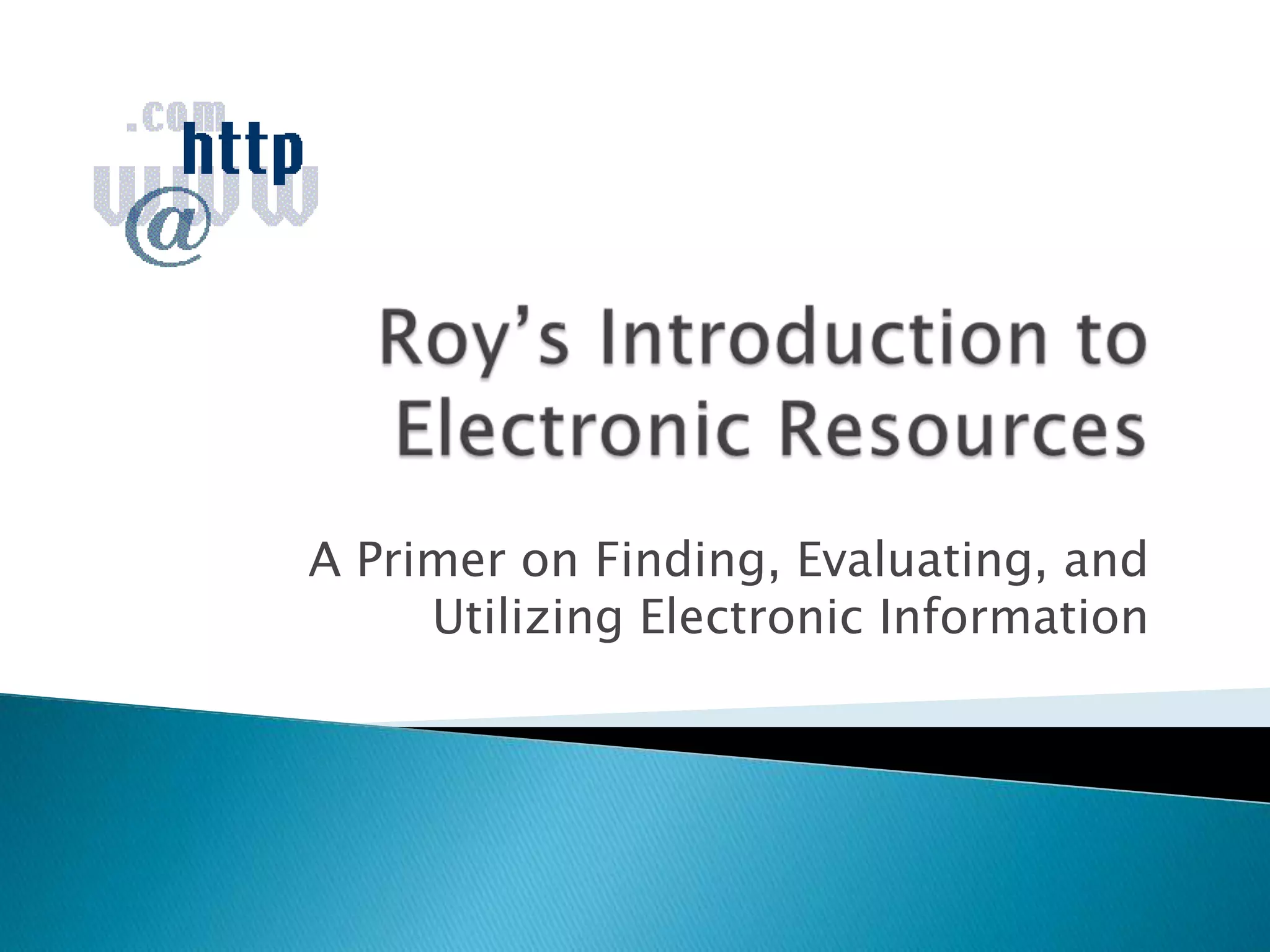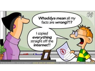 This document provides guidance on evaluating electronic information sources for research. It discusses formulating a research question and where to find answers, such as books, academic journals, newspapers, magazines and the internet. It outlines criteria for evaluating sources, such as checking the author and publisher, assessing the purpose and reliability of the information. It also discusses using search techniques like Boolean operators and quotation marks to refine searches. Domain name extensions like .edu and .gov are explained to determine the type of website. Steps of the research process, including developing search strategies and assessing source quality, are also outlined.