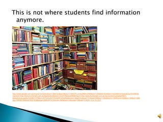 This document discusses how technology has changed how students find and access information. It notes that students no longer rely primarily on books and now investigate information online using various sources. It provides examples of websites, tools and technologies students can use to find relevant information, collaborate with others, and organize resources. These include search engines, social bookmarking sites, cloud computing and personalized learning environments that allow customization. The document suggests students now communicate and work in different ways than previous generations due to growing up with technology as a regular part of their lives.
