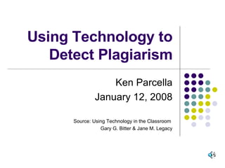 This document discusses ways that teachers can use technology to detect plagiarism in student assignments. It notes that surveys show high rates of cheating and plagiarism among students. It then provides tips for teachers to deter plagiarism, such as educating students about proper citation and structuring assignments in multiple parts. The document recommends that teachers check assignments against in-class work, references cited, and topic appropriateness to detect plagiarism. It also suggests using online tools like Google to search suspicious phrases or subscription services that can match submissions to existing content online.