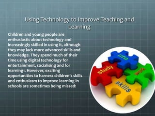 It allows for interactivity, collaboration, communication and a sense of community among students. Technology also provides variety in teaching methods and learning preferences. It enables formative and summative assessment. Examples of technologies that can be used include interactive websites, graphic organizers, social media platforms like Twitter and Edmodo, and communication technologies like videos and photos. The key is harnessing students' existing technology skills and enthusiasm to enhance learning in schools.
