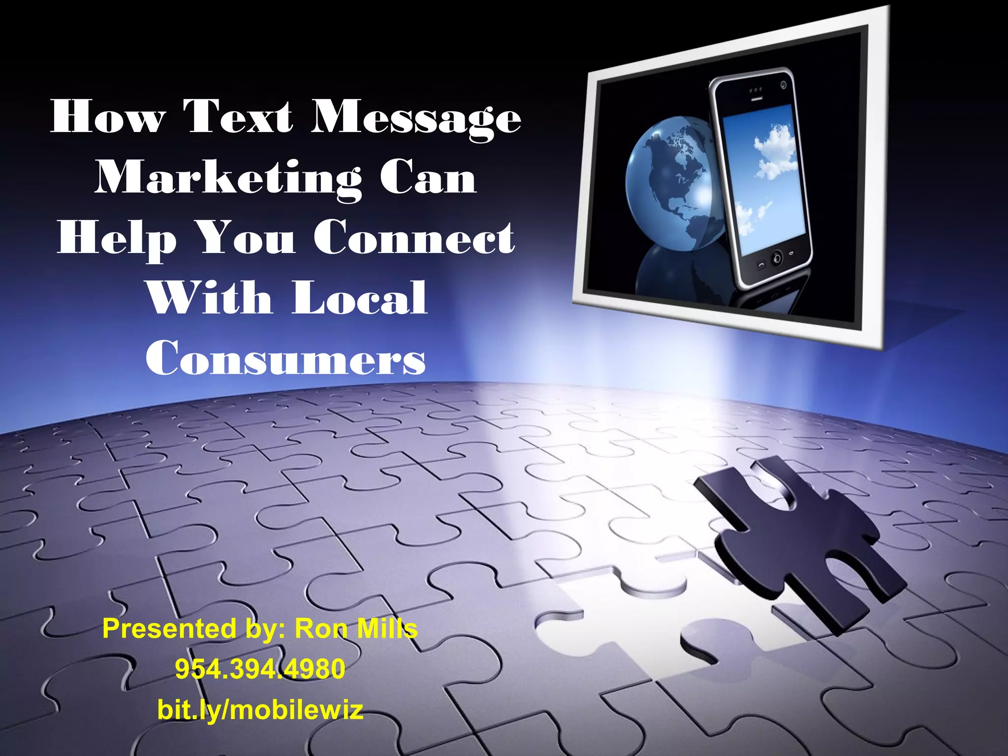 The document discusses how text message marketing can help local businesses connect with consumers by sending promotional offers, reminders, and other helpful information directly to customers' mobile phones. It notes that text messaging has high open and response rates compared to other marketing methods. The presentation encourages local businesses to utilize text message marketing to build their brand, gain an edge over competitors, and increase exposure, sales, and revenue.
