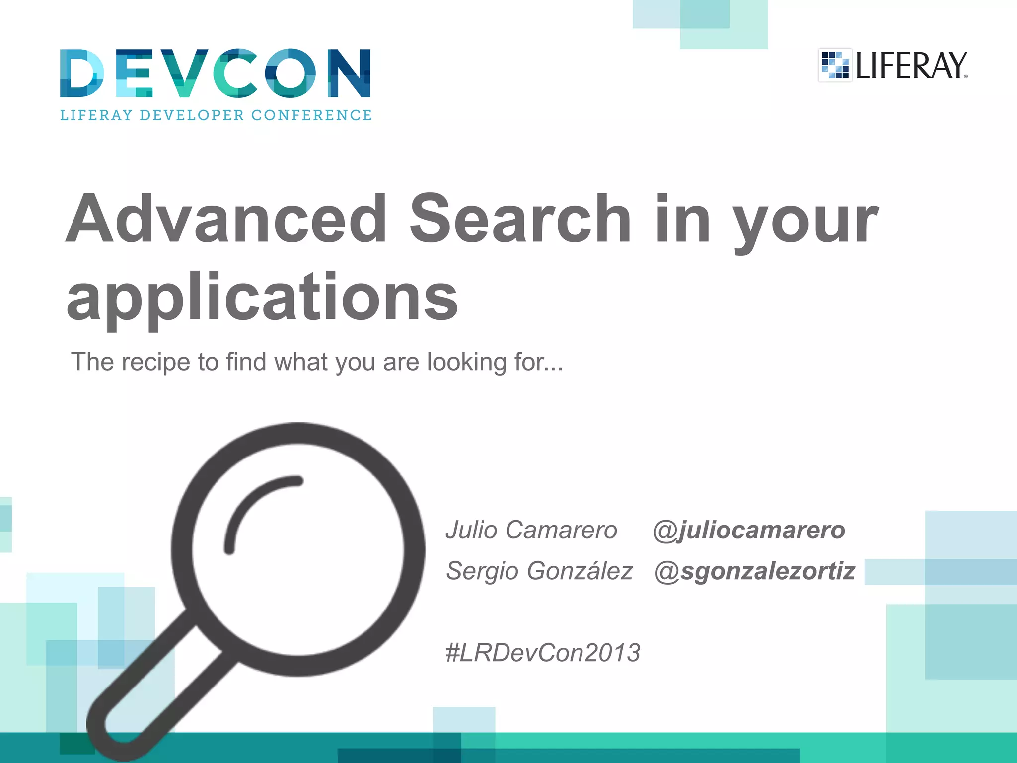 The document outlines steps for adding advanced search capabilities to Liferay applications. It discusses indexing application entities, displaying search results, searching comments and attachments, highlighting search terms, and additional features like real-time filtering as users type. The presentation was given by Julio Camarero and Sergio González at the 2013 Liferay Developer Conference.