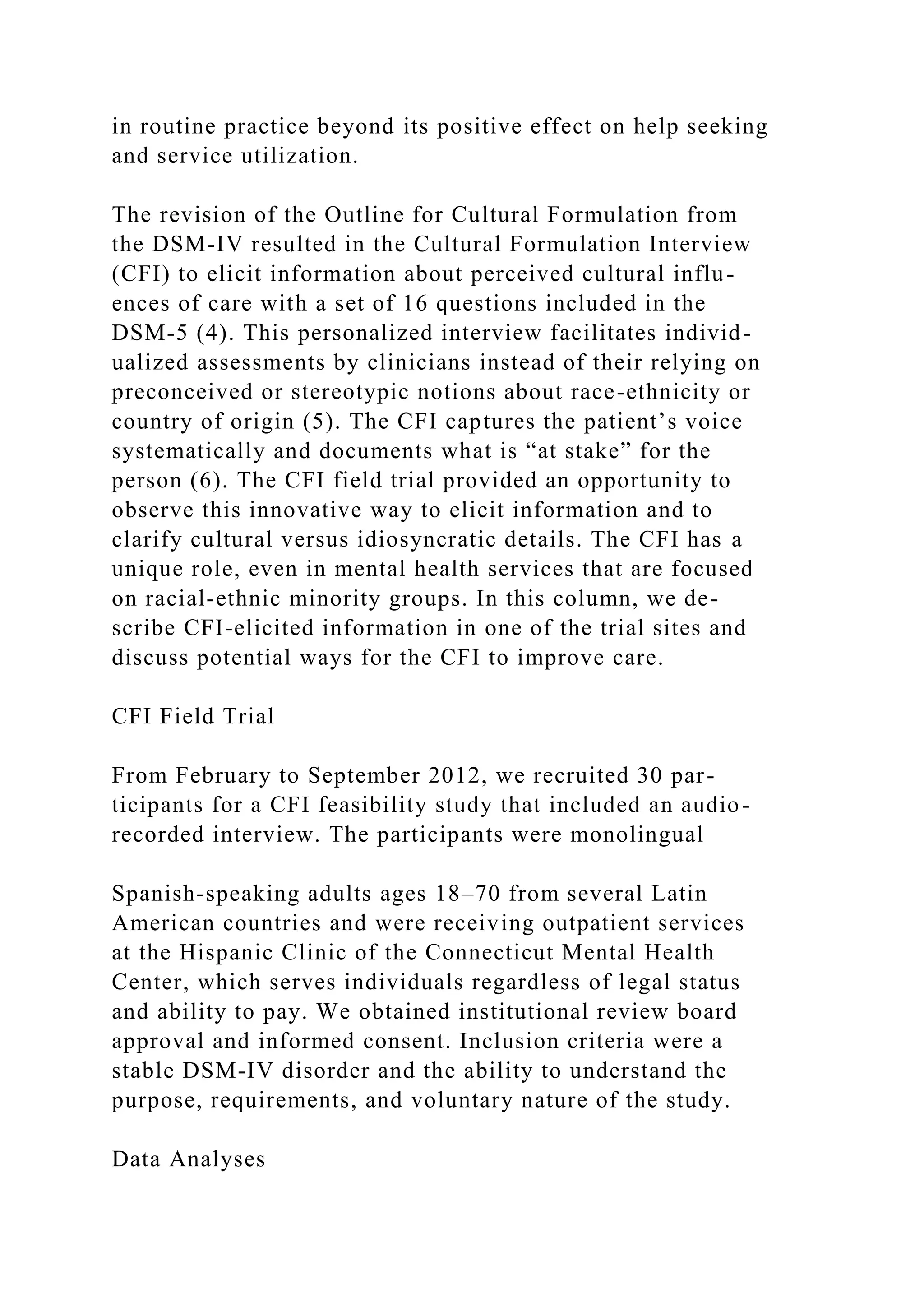 The document discusses the use of the Cultural Formulation Interview (CFI) in developing culturally sensitive mental health services for monolingual Spanish-speaking individuals. Findings from a feasibility study highlight themes such as the importance of trust, restoration of social ties, and addressing stigma, which are crucial for engaging Hispanic patients in treatment. Routine use of the CFI can improve the understanding of patients' unique needs within their cultural context, ultimately enhancing the effectiveness of psychiatric care.