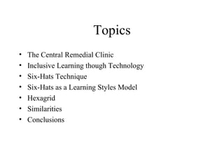 The document discusses using Edward de Bono's Six Hats technique as a model for learning styles. It proposes that each hat (white, yellow, black, green, red, blue) corresponds to a different learning dimension or style. A questionnaire was developed mapping students' strengths to different hats. While this model shows promise, more research is needed to validate whether the Six Hats technique fully captures all aspects of individual learning styles.