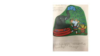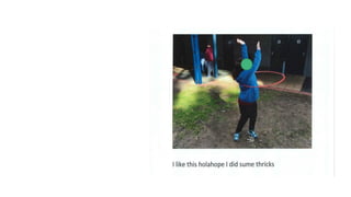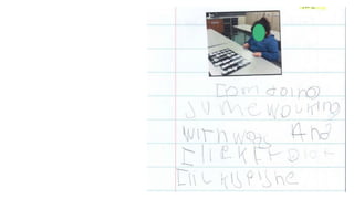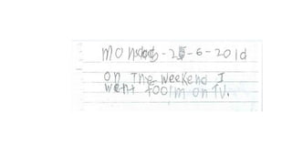 The document discusses the use of the Developmental Writing Scale to measure student progress in writing. It describes the 14 levels of the scale from drawing to multiple coherent paragraphs. The goal is to increase the percentage of students improving at least one level per year based on writing samples. Teachers collect samples twice per year and staff collaboratively rate them on the scale to monitor progress.