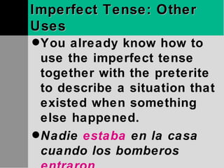 The document discusses the uses of the imperfect and preterite tenses in Spanish. The imperfect tense is used to describe situations, states, or conditions that were ongoing or habitual in the past. It can be used to indicate what the time, day, or weather was like. The preterite tense describes single, definite actions or events that occurred and were completed in the past. The document provides examples of verbs commonly used with the imperfect tense to describe states of being.