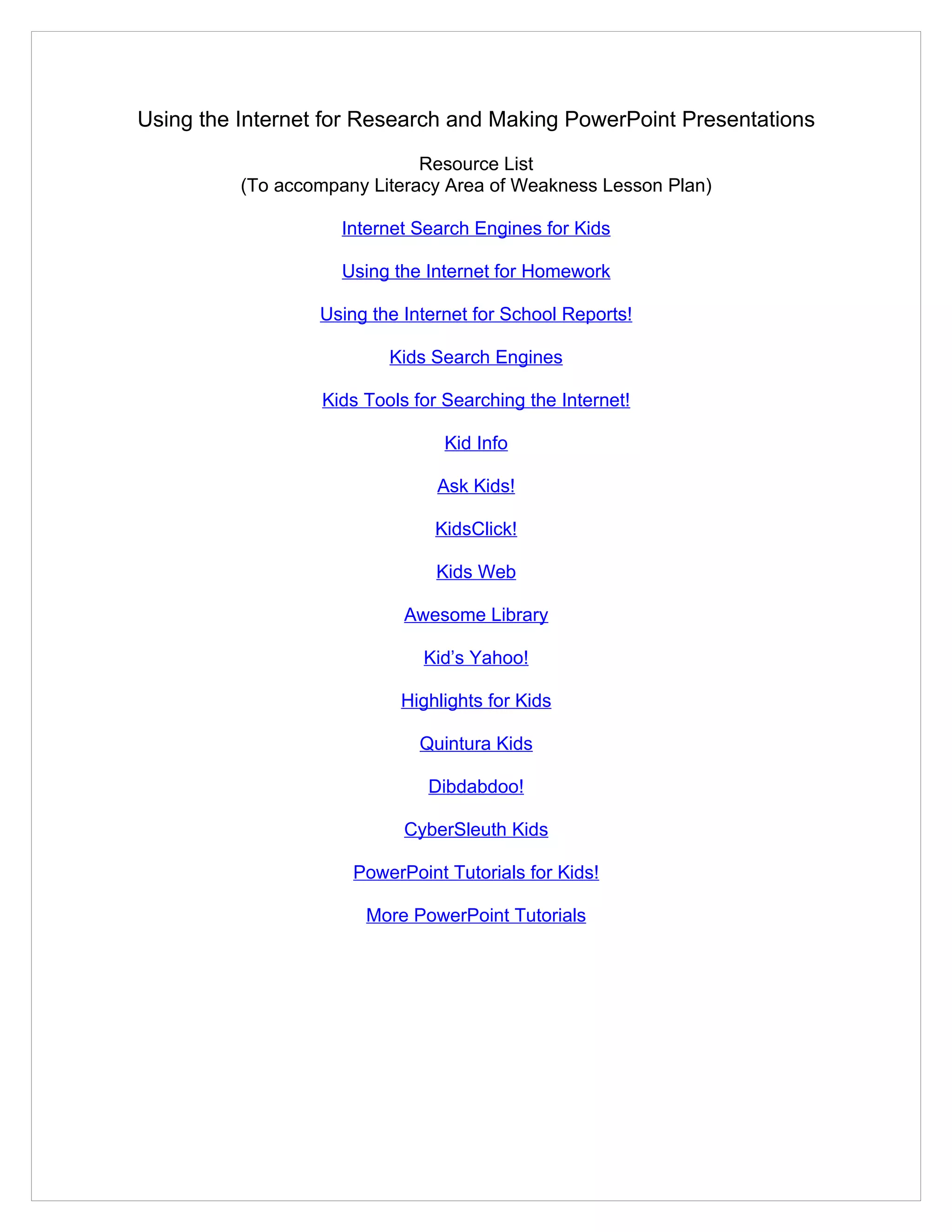 This document provides a list of resources for kids to use the internet for research and making PowerPoint presentations, including search engines designed for kids like KidsClick!, Kids Web, and Quintura Kids as well as general search engines. It also lists PowerPoint tutorial websites for kids to learn how to make presentations.