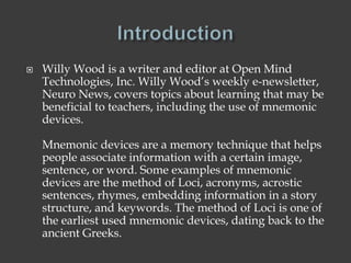 Willy Wood is a writer and editor at Open Mind Technologies, Inc., known for his e-newsletter, Neuro News, which focuses on learning techniques for teachers, specifically mnemonic devices. Mnemonic devices, such as the method of loci, acronyms, and rhymes, are strategies that assist in memory retention by associating information with images, sentences, or locations. The method of loci involves visualizing a familiar space and linking specific pieces of information to different areas within that space to aid memorization.
