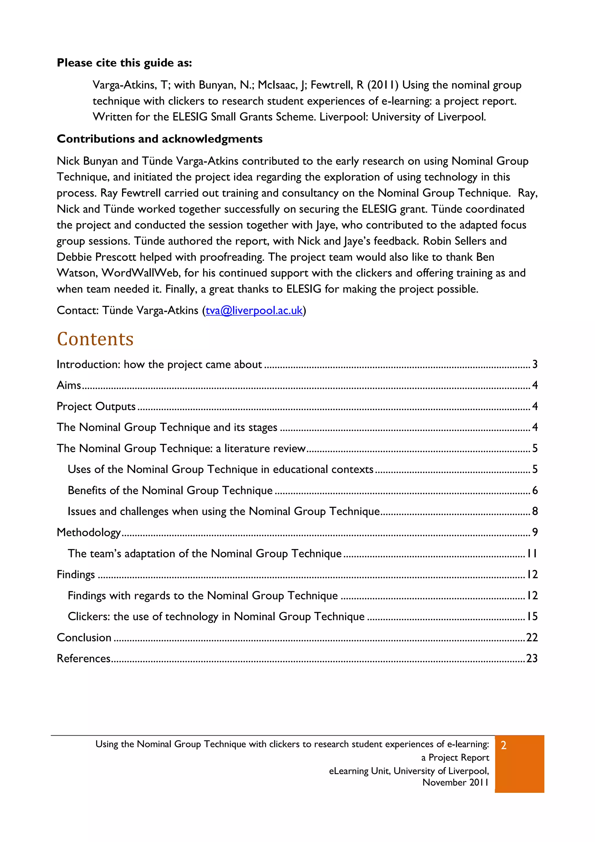 The document is a project report on using the nominal group technique with clickers to research student experiences of e-learning, conducted by a team at the University of Liverpool. It outlines the project's aims to enhance student feedback processes through technology and presents findings on the technique's efficacy in educational contexts. The report includes a literature review, methodology, benefits, challenges, and practical outputs like a guide and an upcoming webinar.