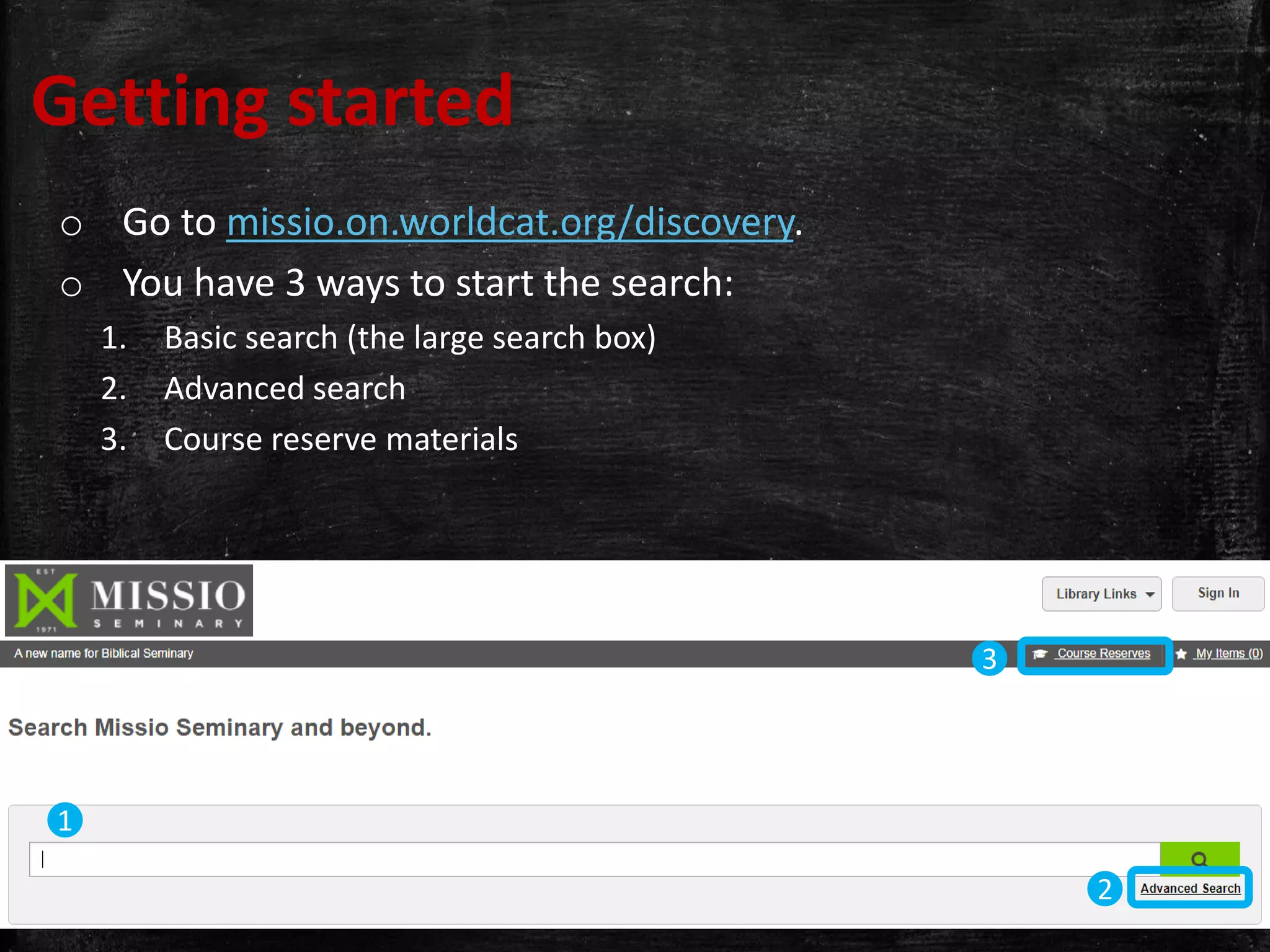 The document provides instructions for using the Missio Seminary Library online catalog to search for and access resources, including how to perform basic and advanced searches, find course reserves, view item details, place holds, save searches and records, cite sources, and get help from the library staff. It outlines the various search and filtering options available and steps for accessing full text online or requesting items through interlibrary loan when not available digitally or in the local collection.