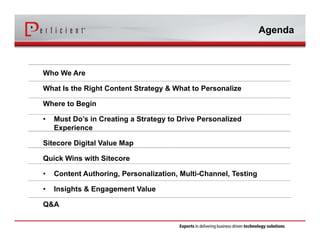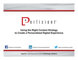 This document discusses using the right content strategy to create personalized digital experiences. It describes Perficient, a consulting firm that helps clients implement business technology solutions. The document outlines key aspects of an effective content strategy, including segmentation, personalization, supporting multiple channels, testing, and insights. It provides examples of how the Sitecore platform allows quick wins in content authoring, personalization, multi-channel support, testing, and insights.