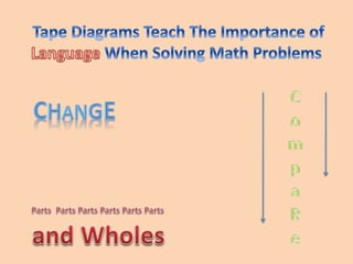 The document discusses using tape diagrams to model mathematical problems involving addition, subtraction, and comparison. It provides examples of how tape diagrams can be used to represent word problems visually and show the relationships between parts and the whole. Tape diagrams foster number sense by making the quantities proportional and meaningful. They allow learners to decompose and recompose quantities in a way that reinforces key concepts like equality.