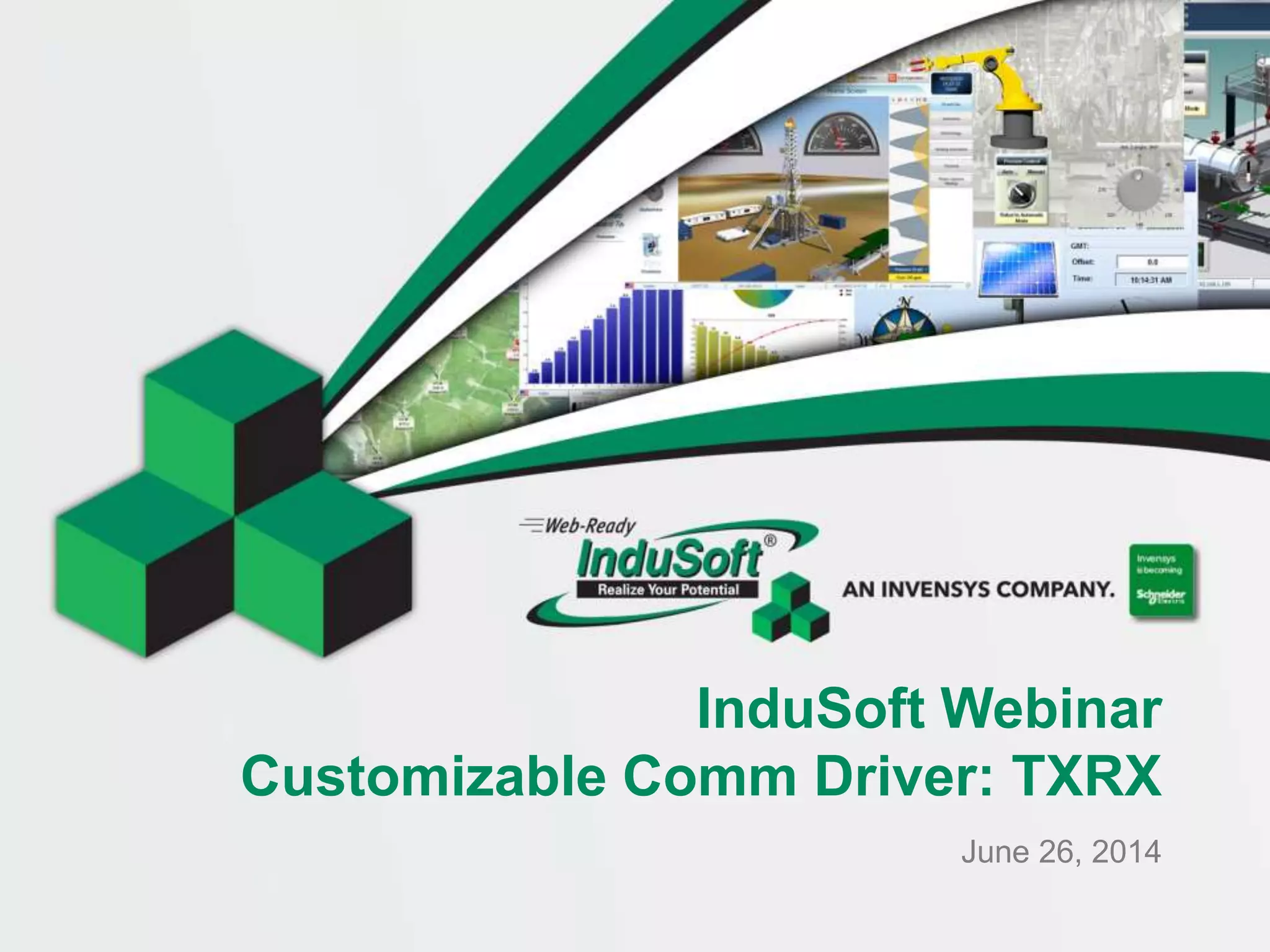 This webinar discusses InduSoft's customizable TXRX communication driver. The driver allows communication with devices over serial or Ethernet connections. The presentation covers configuring the driver settings, sending and receiving messages in ASCII or binary format, and tips for troubleshooting communication issues. A live demo is provided to illustrate exchanging data by sending and receiving messages through the TXRX driver.