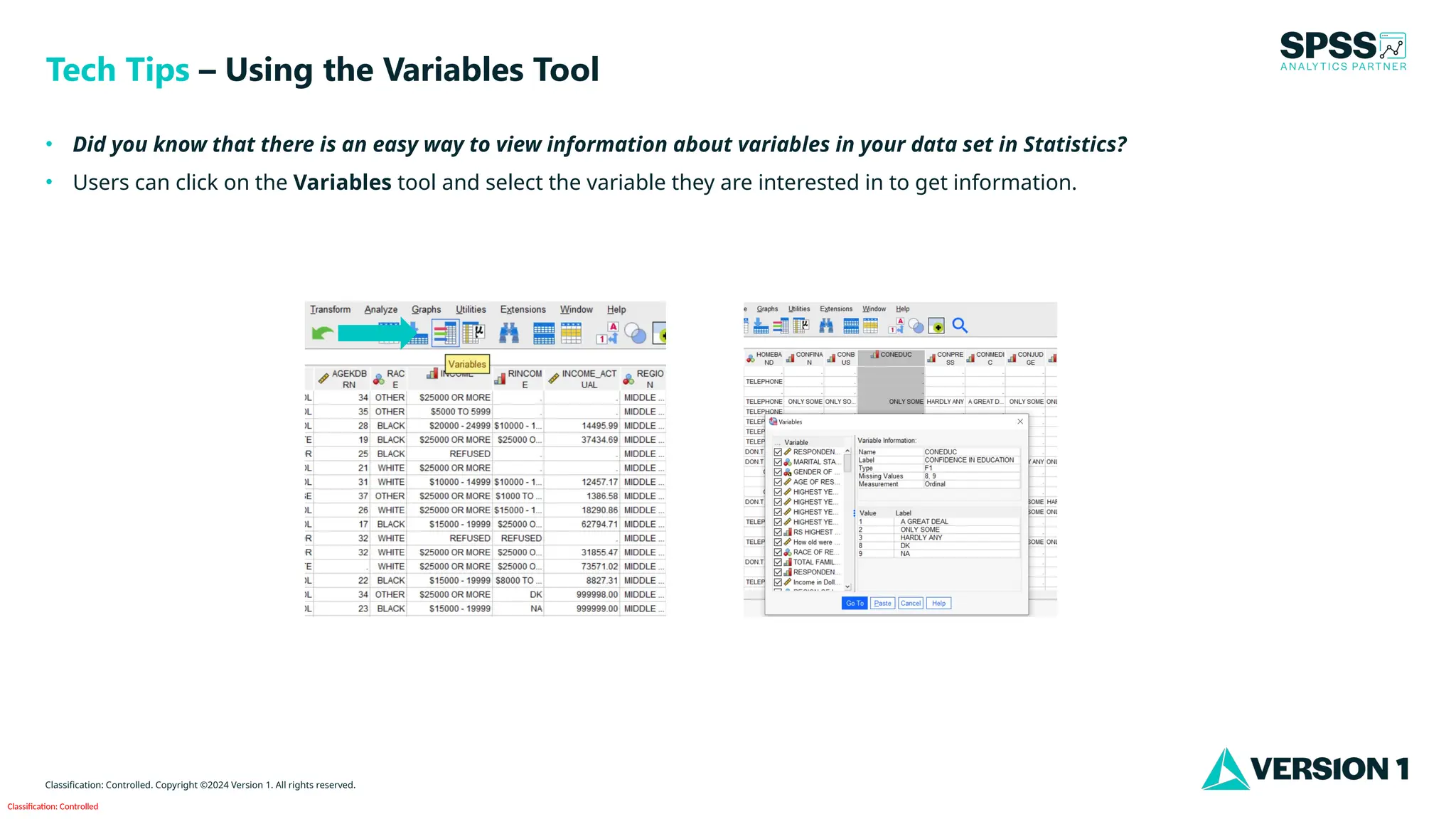 The document provides guidance on using the variables tool in IBM SPSS Statistics to view information about data set variables. It includes an example focused on a survey question regarding 'confidence in education,' showing how to access variable details and category information. Additional resources are available at spssanalyticspartner.com.
