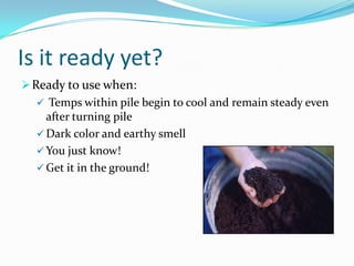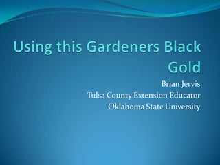 This document provides information about compost and soil amendments from Brian Jervis, a Tulsa County Extension Educator. It discusses how to know when compost is ready to use, the benefits of compost as a soil amendment including improving soil structure and adding nutrients, and how to properly incorporate compost into soil. It also covers using compost as mulch and controlling weeds around trees to promote faster growth. The document provides details on soil testing through Oklahoma State University and notes some things to be aware of when using compost such as ensuring it is finished and not adding too many nutrients or salt.