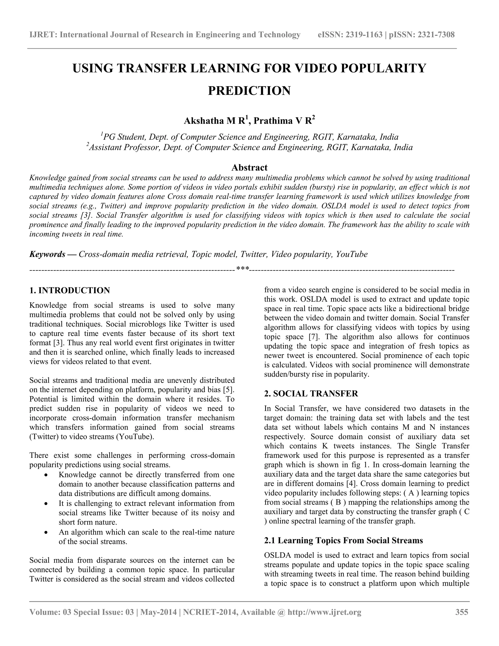 This document discusses a novel cross-domain approach for predicting video popularity using transfer learning from social media streams, specifically Twitter. The proposed framework leverages real-time insights to enhance video categorization by integrating social prominence with traditional view counts. The method incorporates the OSLDA model for topic extraction and employs a transfer graph for data integration, ultimately improving accuracy in predicting sudden spikes in video popularity.