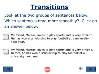 This document discusses the use of transitions in writing. It defines transitions as words that connect one idea to another and provide the logical relationship between them. The document categorizes different types of transitions based on relationships like time, contrast, addition, and result. It provides examples of transitions and exercises to identify proper transitions.