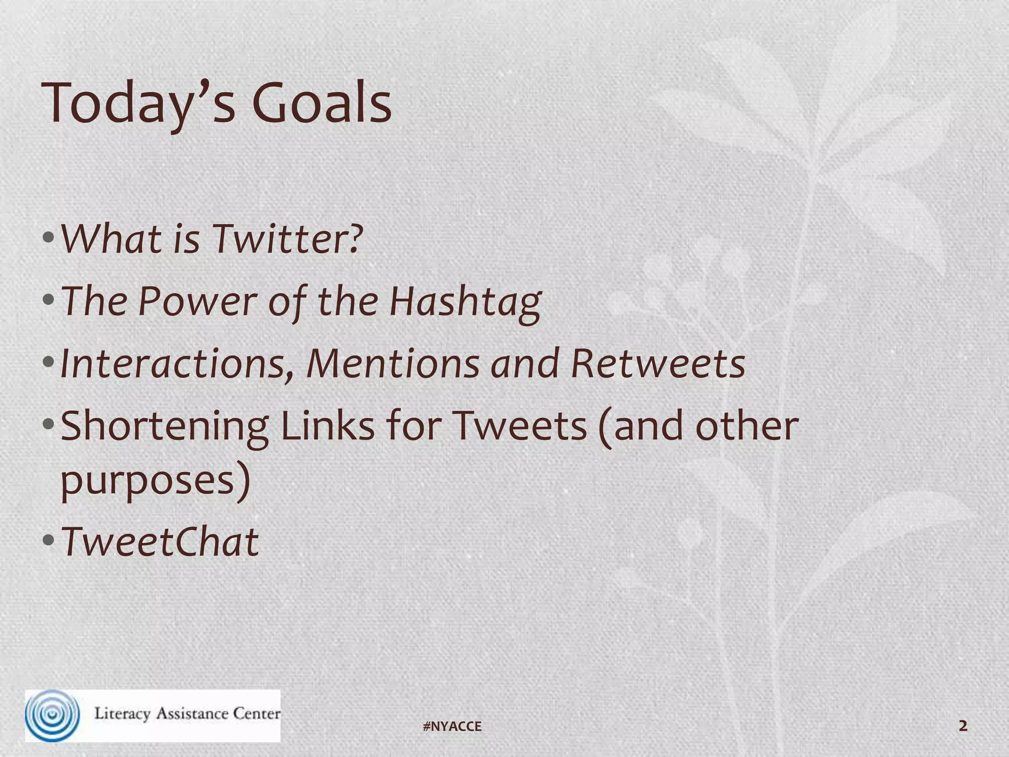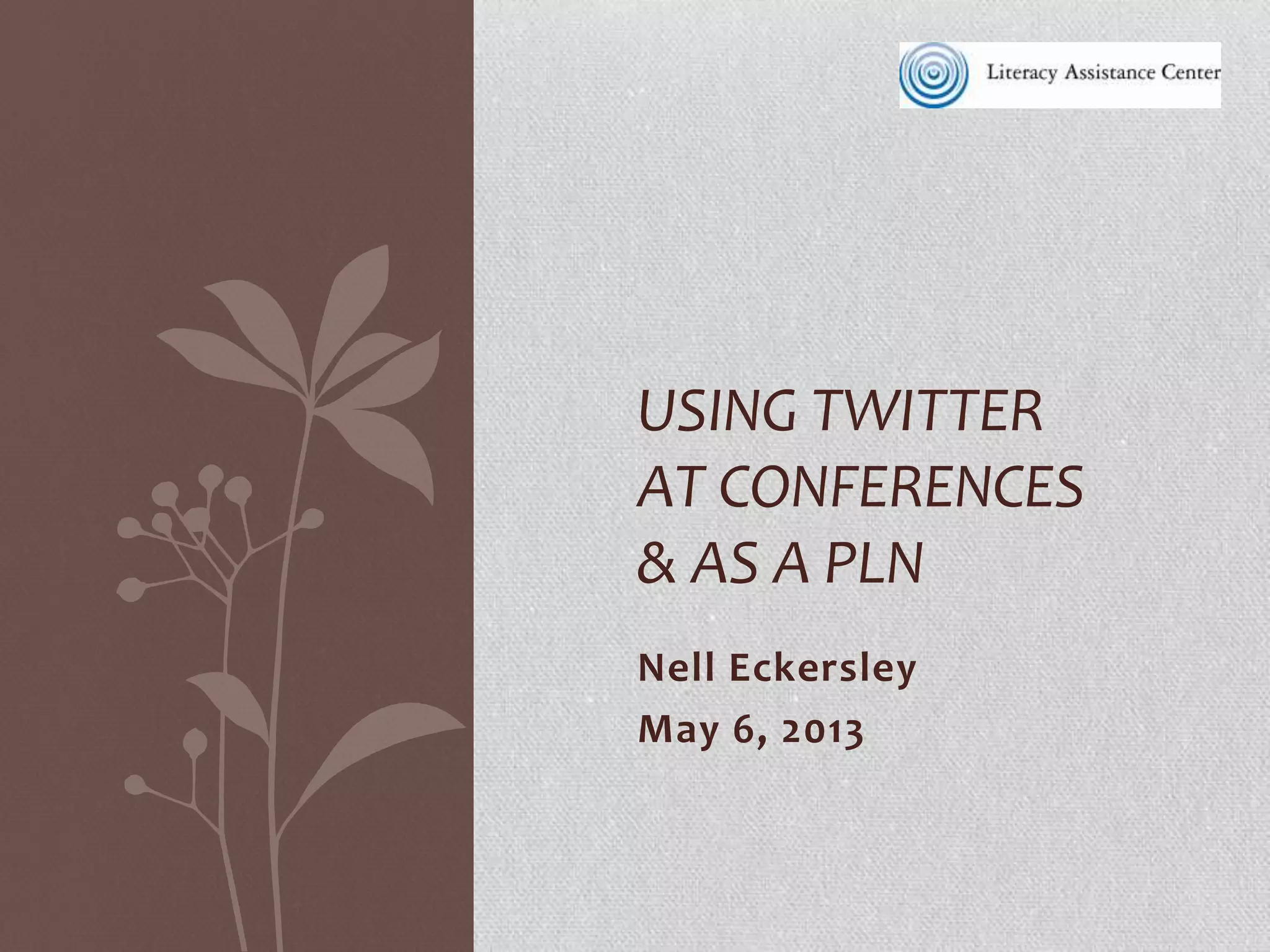 This document summarizes a workshop on using Twitter at conferences and as a personal learning network. The agenda includes introductions, an overview of Twitter features like retweets and hashtags, tools for Twitter like TweetChat and TwitPic, how to find people to follow and get followers, and next steps for using Twitter. The workshop provides advice on using hashtags to make tweets searchable, shortening URLs, finding and engaging with others on Twitter around topics like #AdultEd and #VAILL, and spending time on Twitter each day.