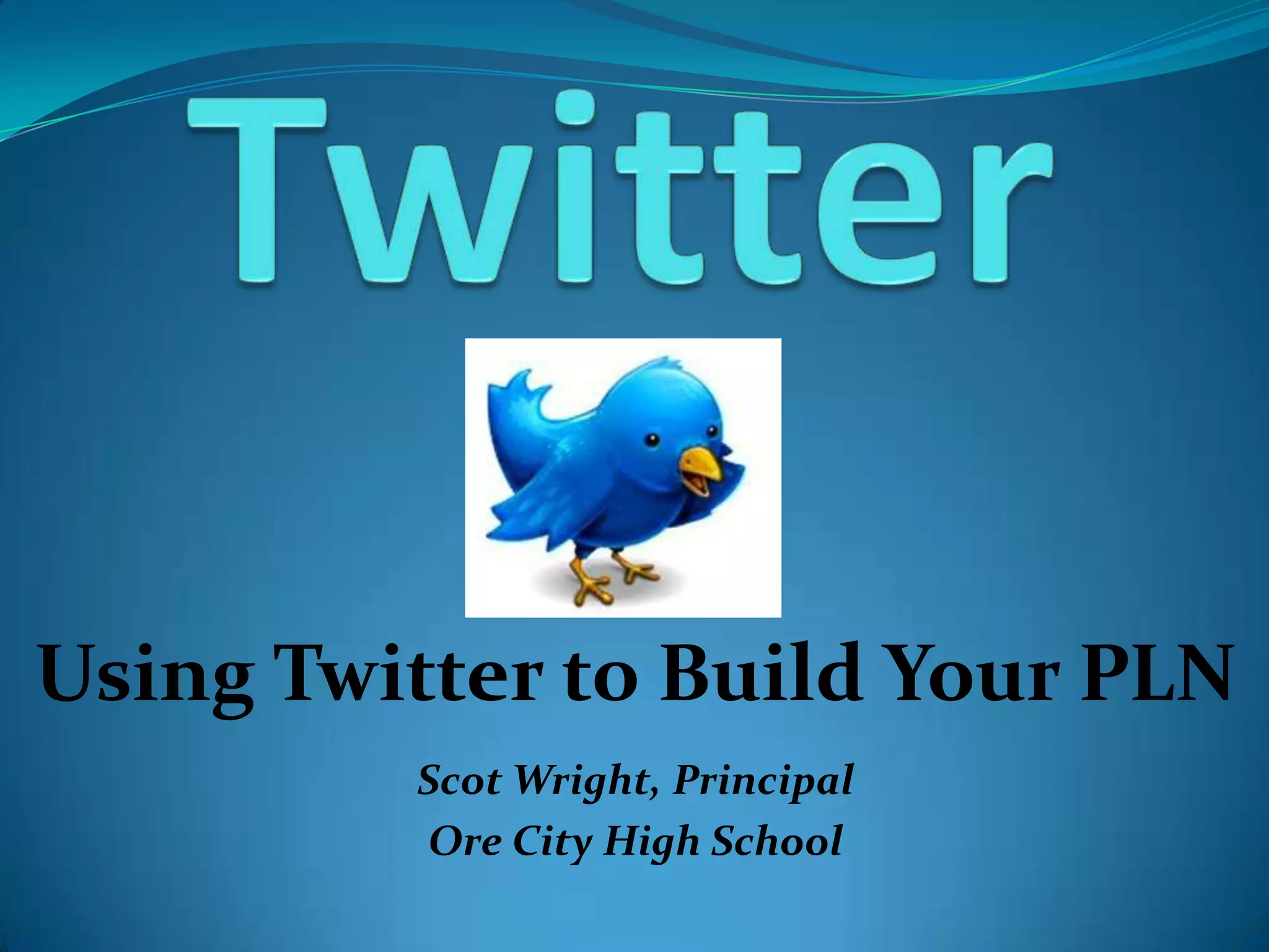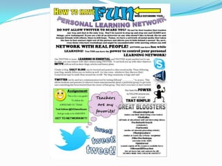 The document discusses how to use Twitter to build a personal learning network (PLN) by following and interacting with other educators online in order to access free and ongoing professional development. It provides an overview of Twitter basics like profiles, hashtags, following others, and participating in educational chats. Educators are encouraged to sign up for Twitter and send their first tweet to start connecting with others.