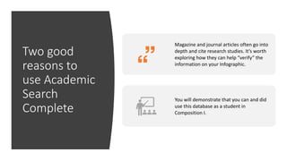 The document provides instructions for using the UT Library database Academic Search Complete to search for magazine and journal articles on a topic. It describes how to log in to the database, perform basic and advanced searches using keywords and Boolean operators, filter search results by source type and date, and preview and save or cite relevant articles found in the results. The goal is to help students use academic databases to verify information and strengthen their research for college-level writing assignments.