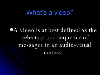 Videos can be an effective tool for language teaching when used appropriately. They provide visual context that helps learners comprehend the target language. Videos expose learners to authentic examples of speech patterns, vocabulary, and cultural situations. However, videos are only useful if they are relevant to the lesson, at an appropriate language level, and not too distracting or long. Teachers should select short video clips with clear beginnings, middles, and ends to focus on specific language or skills.