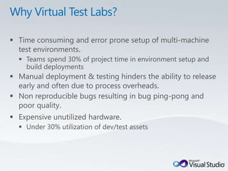 The document describes a process for developing and deploying SharePoint solutions that involves manually compiling code, rebuilding the SharePoint environment, and deploying the solution. It also shows an automated process where tests are run automatically after deployment, the environment is restored to a clean state using a snapshot, and the solution is automatically deployed.