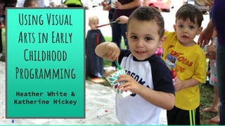 This document provides guidance for using visual arts in early childhood programming. It discusses the benefits of art for young children, including developing motor skills, cognitive abilities, and social-emotional skills. Four art projects are described in detail with supply lists, instructions, video demonstrations, and book connections. The projects allow for open-ended creative expression and include silly face paintings, crumpled flower collages, twirling sculptures, and action painting. Resources for further planning arts activities for toddlers and preschoolers are also provided.