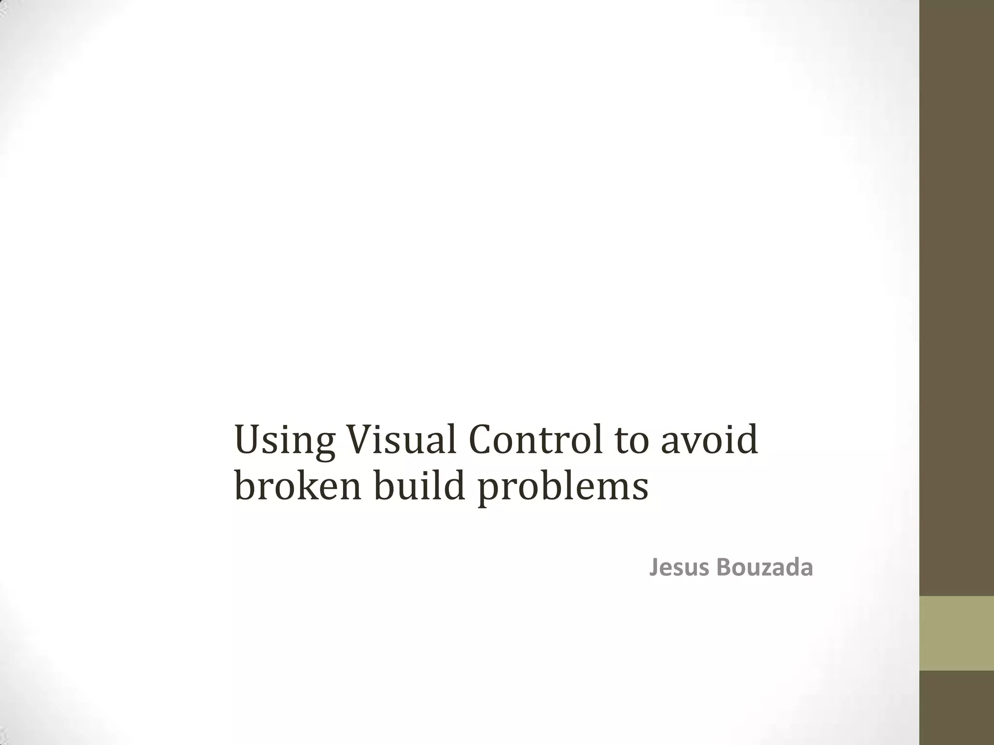 The document discusses using visual control to address issues related to broken builds in continuous integration practices. It emphasizes the importance of frequent integration, immediate error detection, and fostering a culture that prioritizes fixing issues to maintain quality. By implementing visual displays of build statuses, the average time lost due to broken builds can be significantly reduced.
