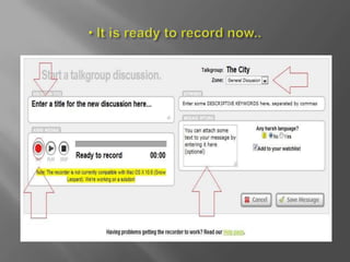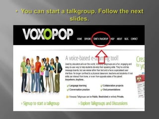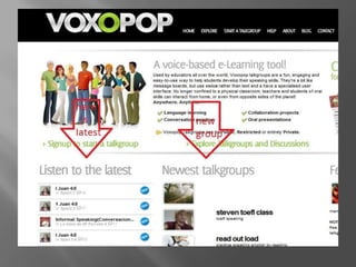 Voxopop is a free online tool that allows teachers to easily create recorded discussions for language learners to access and practice spoken English. It enables interaction through student introductions and conversations, practicing intonation, pronunciation, and narrative building. Students can develop speaking, pronunciation, and listening skills by sharing recordings, both in class and at home. Voxopop requires only a computer, microphone, and internet access.
