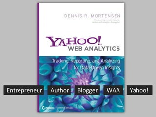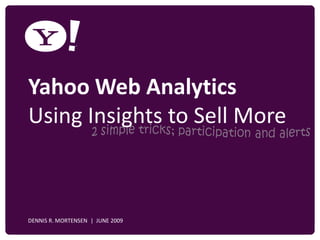 This document discusses how Yahoo Web Analytics can provide insights to help optimize website content and increase revenue. It shows how reports on top content and search phrases can be customized, expanded, sorted, and filtered to identify opportunities like pages that drive a high percentage of revenue despite receiving few visits. Alerts are also described as a way to notify users of such opportunities. The document encourages learning more about analytics and marketing on the VisualRevenue blog.