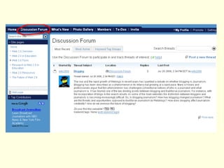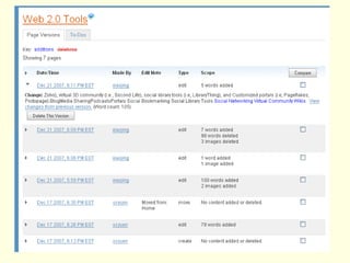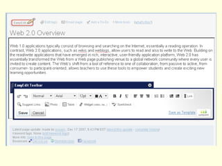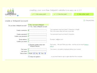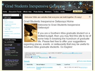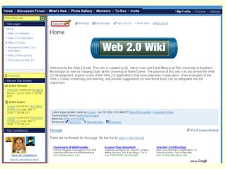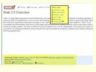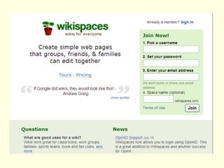 A wiki is a collaborative website that allows users to easily add and edit content. Wikis are useful educational tools as they encourage collaboration and sharing of information. They allow students and teachers to work together online to create and edit documents, discuss course materials, and build a community of learners. Key benefits of using wikis in education include reducing redundant work, interlinking concepts, enabling multiple edits of content, and making information searchable and updatable over time. Teachers can create wikis for managing class materials and discussions, while students can use wikis for collaborative research projects and distributing what they've learned.