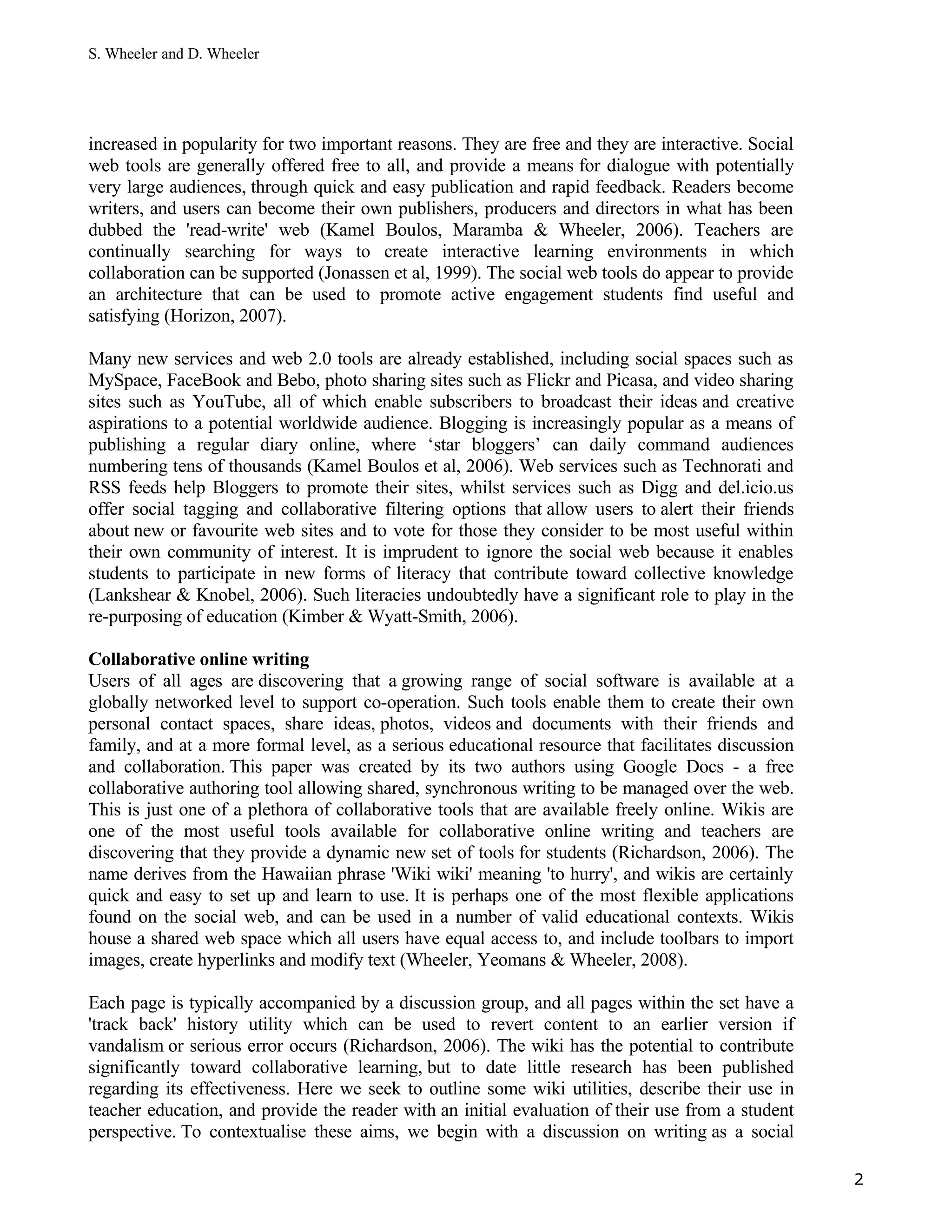 This paper explores the use of wikis to enhance academic writing and collaborative learning among undergraduate teacher trainees. The study indicates that wikis can improve students' writing skills and critical engagement, despite some limitations such as reluctance to edit peers' contributions. Data collected from discussions and questionnaires reveal students' awareness of their audience impacting their writing quality in the collaborative environment.