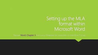 This document provides a guide on setting up MLA format in Microsoft Word, emphasizing the importance of consistency for readability in academic papers. Key formatting details include setting margins to 1 inch, using Times New Roman font at 12 pts with double spacing, and properly formatting headers and the works cited page. Additional resources like Purdue Owl are referenced for guidance on citation and formatting standards.