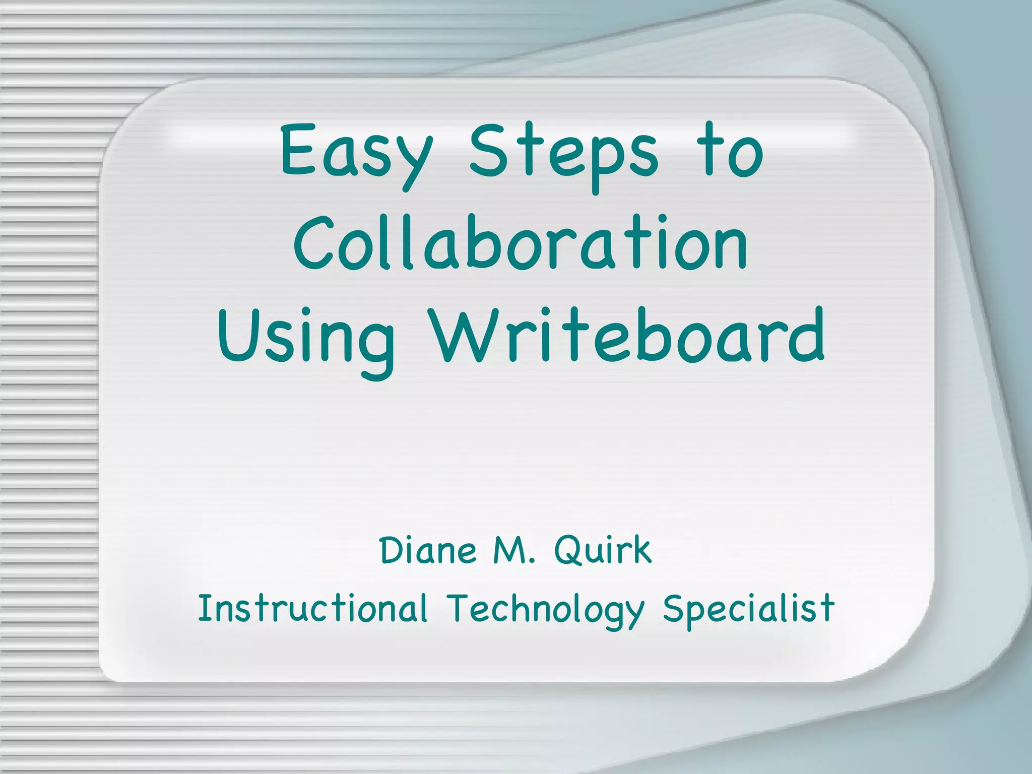 The document outlines three easy steps for collaboration using Writeboard: naming the Writeboard, setting a password, and entering an email address. Users can add text, save their contributions, and engage in discussions by commenting on others' ideas. Formatting options are available to enhance the collaboration experience.