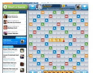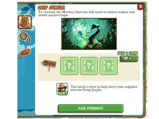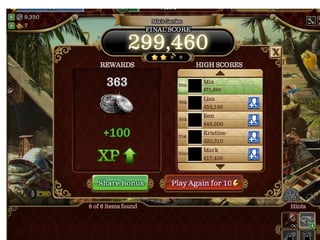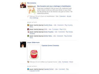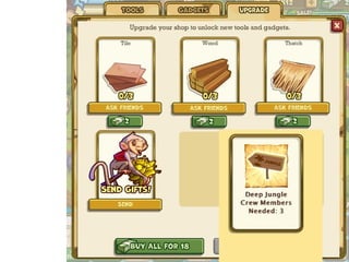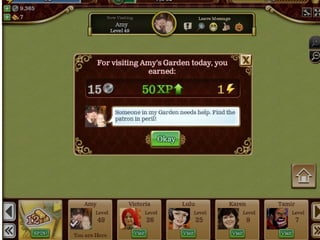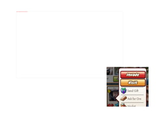 The document summarizes a study of social interaction mechanics in social games. It found that the most common interactions are friending via friend bars, asynchronous visiting of friends' spaces, gifting between friends, and leaderboard-based challenges. Interactions usually focus on trading virtual goods and leaving traces of visits rather than meaningful communication. Recent innovations include real-time challenges and synchronous chat, but most games still prioritize solo play over cooperation.