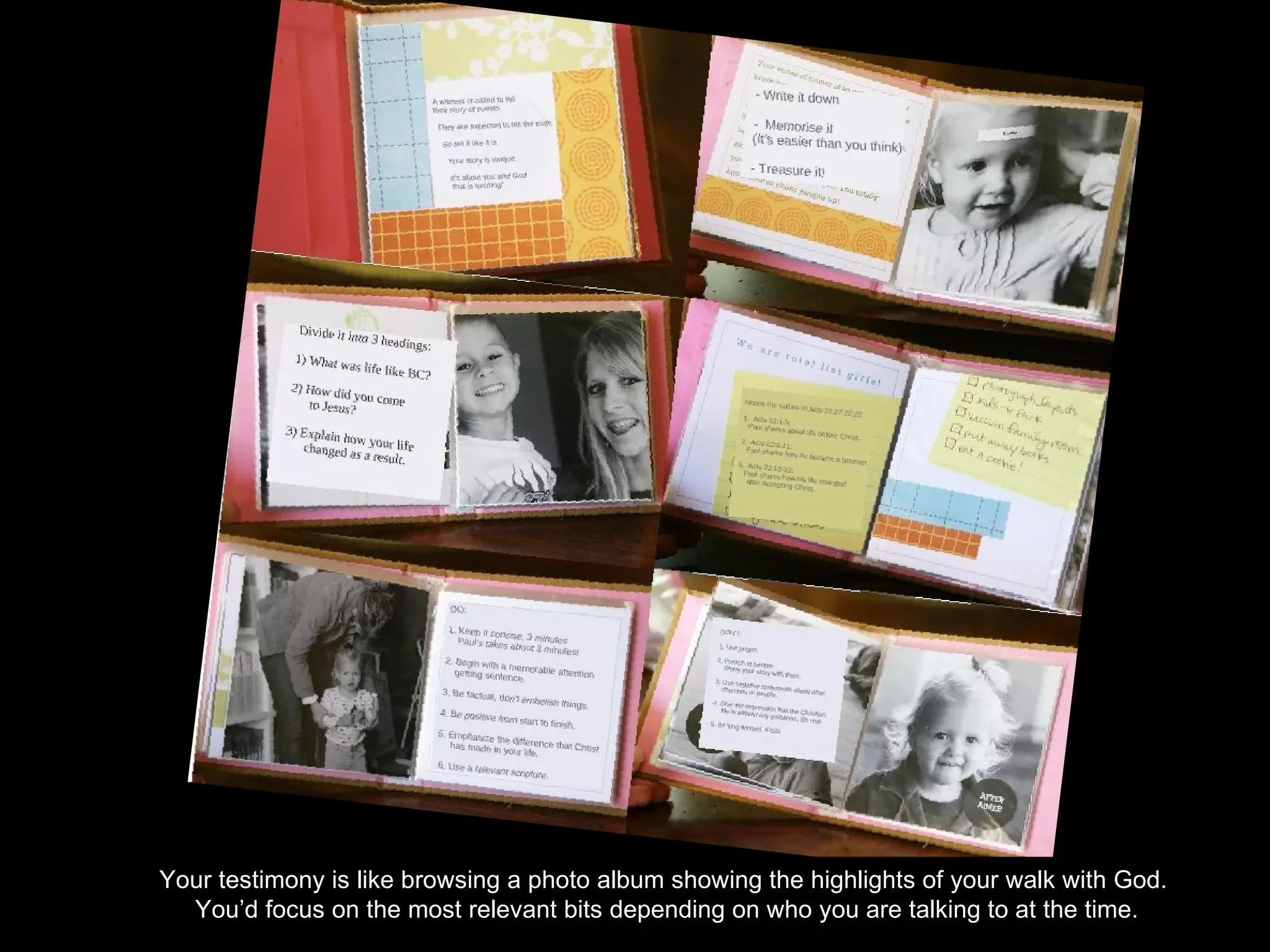 The document encourages individuals to share their personal testimony of faith, likening it to a photo album showcasing significant moments. It suggests organizing the testimony into three parts: beginning, middle, and end, and offers tips on effective storytelling. Additionally, it recommends keeping a journal or scrapbook to document ongoing spiritual experiences.