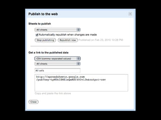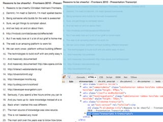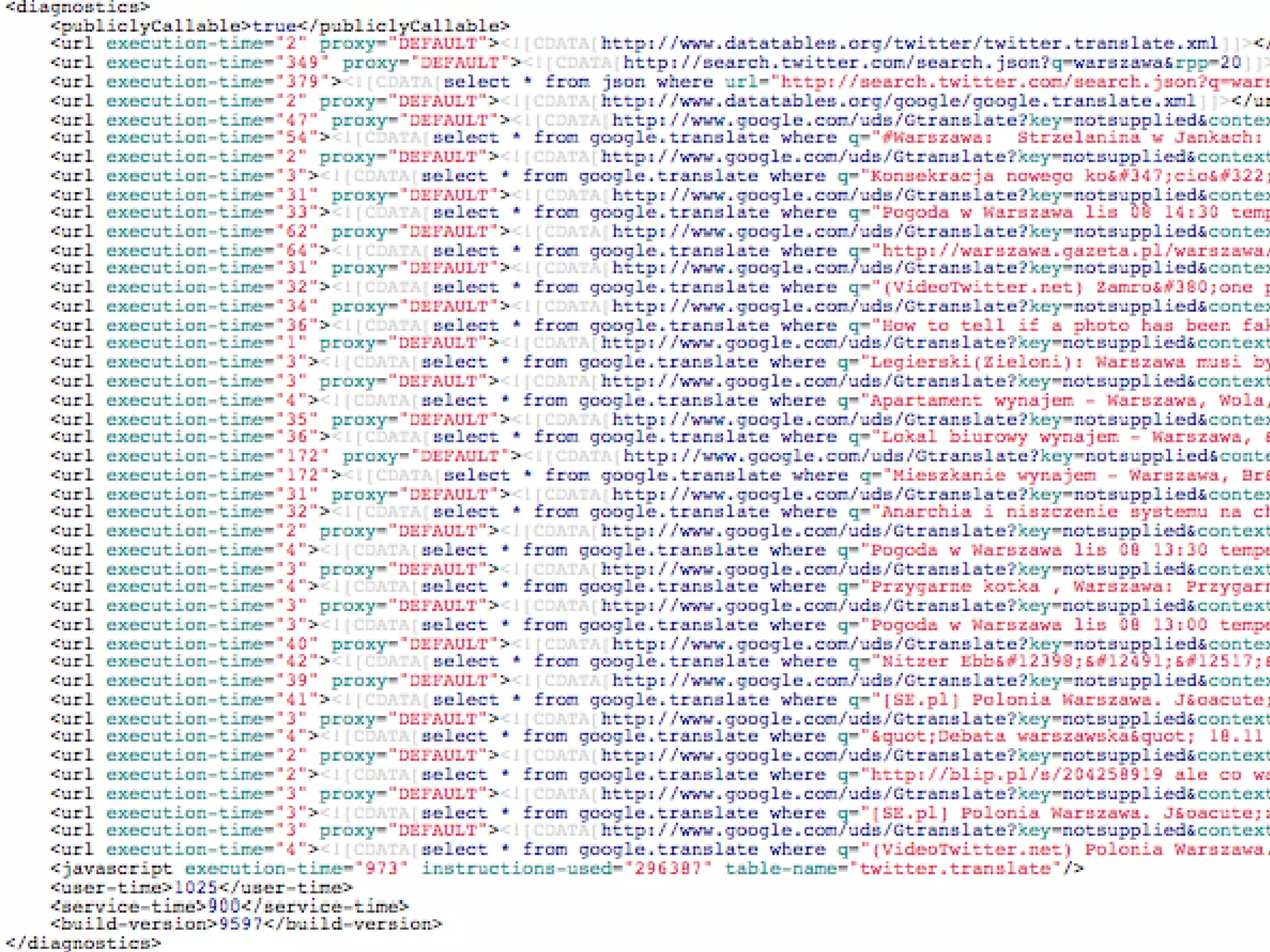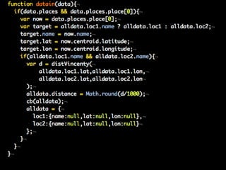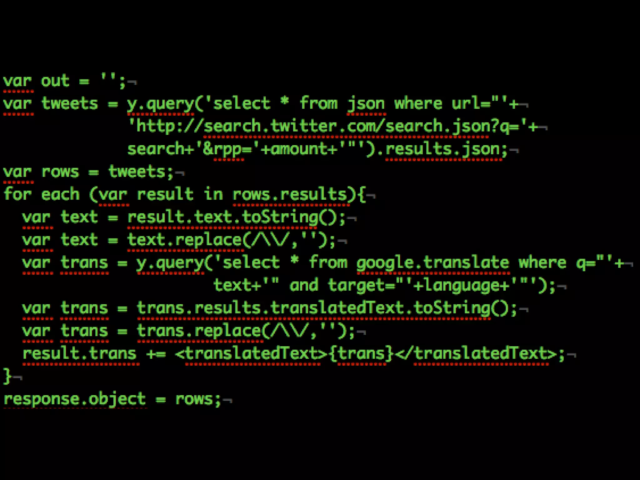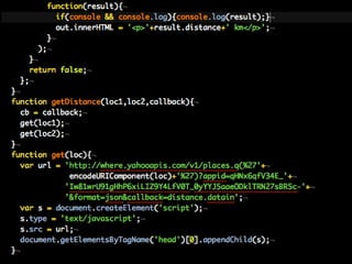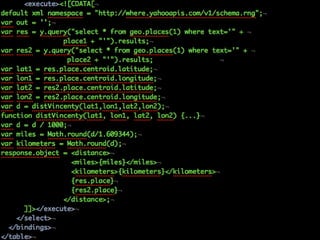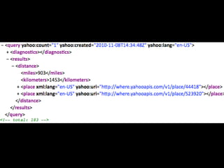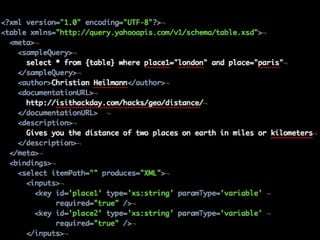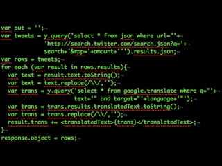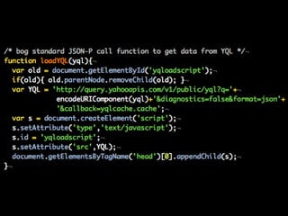 The document discusses using Yahoo Query Language (YQL) to efficiently cache, collate, and filter data through various web services and APIs. It proposes examples of building applications, such as calculating distances and translating foreign tweets, while highlighting issues around asynchronous requests and key management. The author encourages leveraging YQL for simplified access to data and better performance through local storage solutions.
