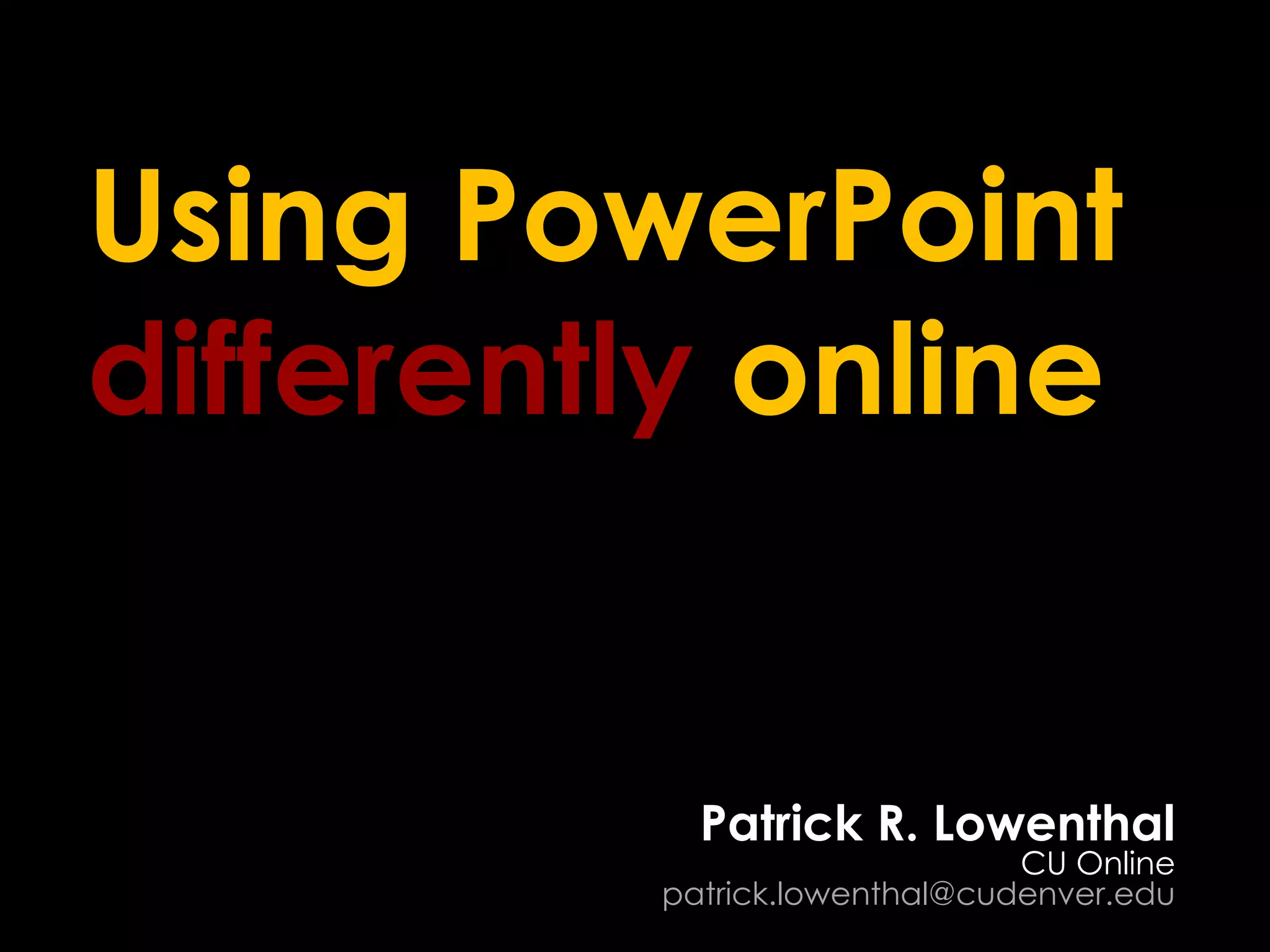 The document discusses using PowerPoint differently for online learning compared to in-person presentations. Some key points: