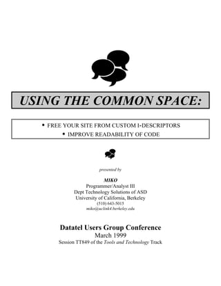 This document discusses using the common space in Unidata to pass arguments between programs and subroutines. It introduces XMIK.COM, a subroutine that populates a named common space called /XMIKCOM/ with data. It also introduces XMIK.GETCOM, a subroutine that retrieves data from the /XMIKCOM/ common space. Using these subroutines allows passing data between programs without customizing i-descriptors. The common space provides a way to share data within a single login or process.