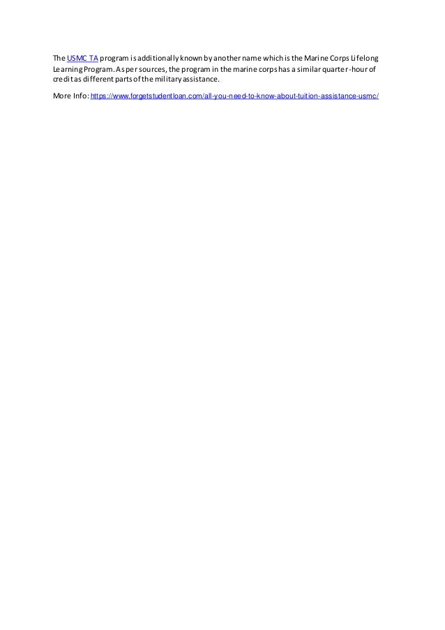 The USMC Tuition Assistance (TA) program is also referred to as the Marine Corps Lifelong Learning Program. It offers a quarter-hour of credit similar to other military branches' assistance programs. For more information, visit the provided link.